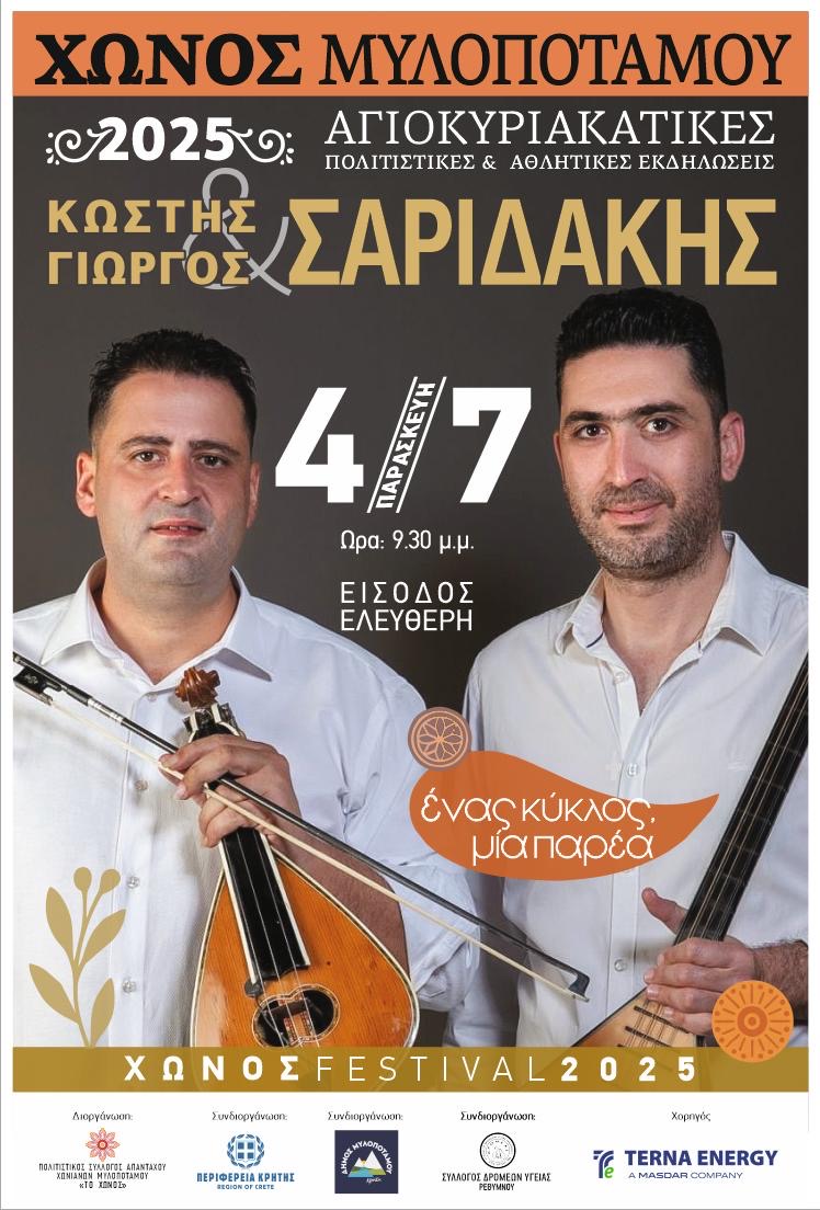 Οι φετινές πολιτιστικές εκδηλώσεις στο Χώνος Μυλοποτάμου που έχουν τίτλο «ένας κύκλος μια παρέα» και πραγματοποιούνται στον προαύλιο χώρο του Δημοτικού Σχολείου, ξεκινούν την Παρασκευή 4 Ιουλίου, στις 21:30 με ένα γνήσιο κρητικό γλέντι από τον Κώστα Σαριδάκη και το συγκρότημά του. Ο Κώστας Σαριδάκης δεν χρειάζεται ιδιαίτερες συστάσεις καθώς είναι γνωστός για την αυθεντικότητά και την αφοσίωσή του στην κρητική μουσική. Θα χορέψει ο χορευτικός σύλλογος Τ΄Αόρη του Στέλιου Πατελάρου και της Κατερίνας Ανδρεαδάκη.