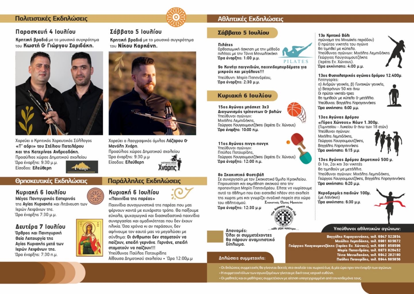 Την Κυριακή 06 Ιουλίου διοργανώνονται Αγώνες μπάσκετ και Πιγκ Πογκ καθώς και Σκακιστικό φεστιβάλ σε συνεργασία με τον Σκακιστικό Όμιλο Ηρακλείου ενώ στη συνέχεια θα πραγματοποιηθεί το Αγώνισμα της Μινωικής Περιόδου, το Κρητικό βόλι.