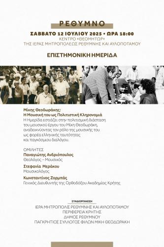Οι σημαντικές επιστημονικές εκδηλώσεις στην Κρήτη, θα περιλαμβάνουν εισηγήσεις από ακαδημαϊκούς, θεολόγους και μουσικολόγους, οι οποίοι θα προσεγγίσουν το πολυσχιδές έργο του Μίκη Θεοδωράκη μέσα από τις διαστάσεις της μουσικής δημιουργίας, της πολιτικής και πολιτιστικής του δράσης, της κοινωνικής του παρέμβασης και της διεθνούς του παρουσίας. Επίσης, στο Φεστιβάλ Βιβλίου Χανίων, θα παρουσιαστεί η έκδοση του νέου βιβλίου, με τίτλο «Πολίτης – Πολιτισμός – Πολιτική», εκδ. Ακρίτας (2025), το οποίο περιλαμβάνει τα πρακτικά του Συνεδρίου «Σοσιαλισμός και Πολιτισμός (1977) καθώς και «Μαρξισμός και Ορθοδοξία» (1987) στην Ορθόδοξο Ακαδημία Κρήτης.
