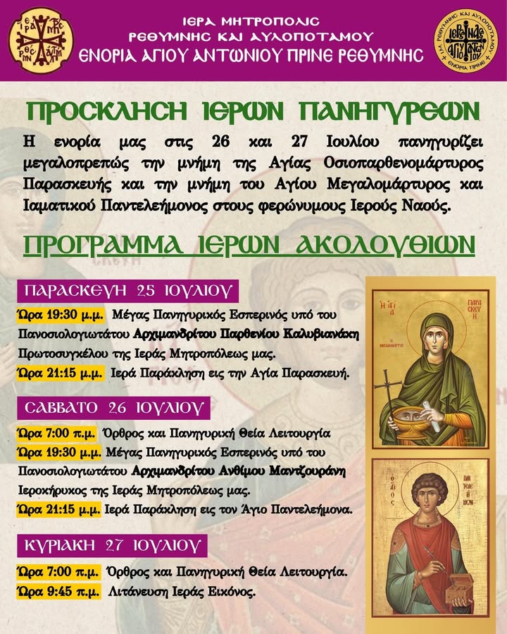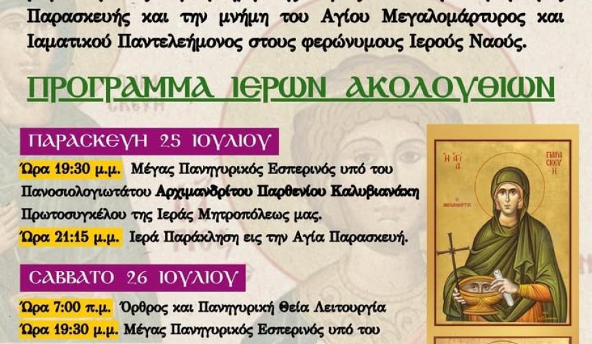 Η ενορία μας στις 26 και 27 Ιουλίου πανηγυρίζει μεγαλοπρεπώς την μνήμη της Αγίας Οσιοπαρθενομάρτυρος Παρασκευής και την μνήμη του Αγίου Μεγαλομάρτυρος και Ιαματικού Παντελεήμονος στους φερώνυμους Ιερούς Ναούς.