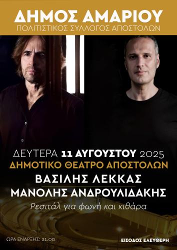 Την Δευτέρα 11 Αυγούστου ο Βασίλης Λέκκας και ο Μανόλης Ανδρουλιδάκης έρχονται για ένα «Ρεσιτάλ για φωνή και κιθάρα» στο Δημοτικό Θέατρο Αποστόλων.