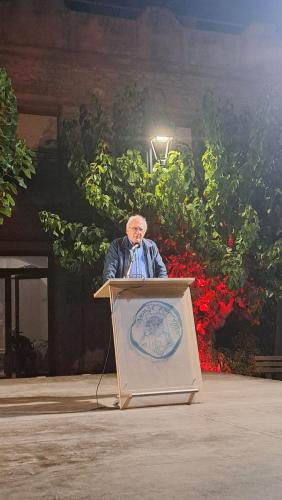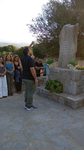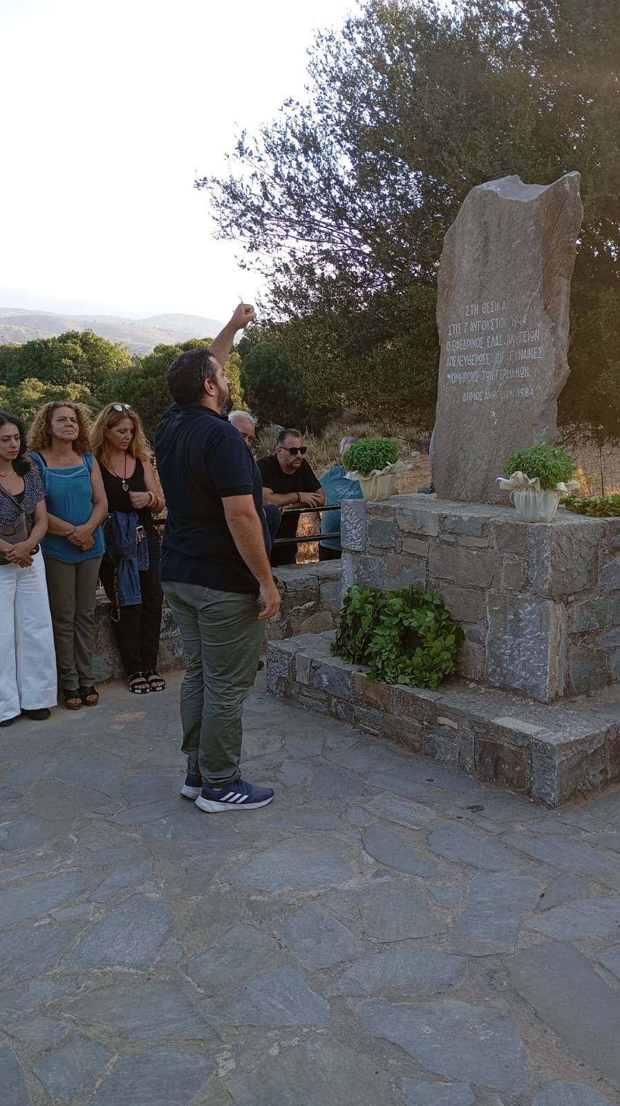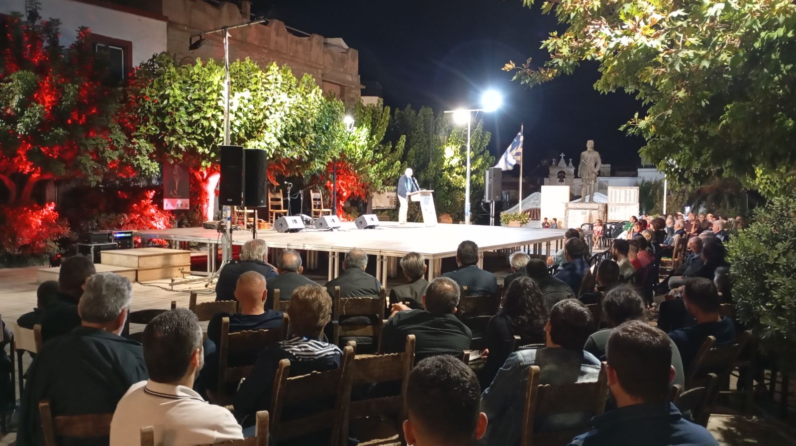Αργότερα, στην Πλατεία Αρμί στα Ανώγεια, η εκδήλωση άνοιξε με τον δημοτικό σύμβουλο Ανωγείων, Μπάμπη Σταυρακάκη να καλωσορίζει τους παρευρισκόμενους και με χαιρετισμό της προεδρου του παραρτήματος Ρεθύμνου της ΠΕΑΕΑ-ΔΣΕ, Ελένης Δραμιτινού ενώ κεντρική ομιλία έγινε από τον Γιώργο Μαργαρίτη, καθηγητή Νεότερης και Σύγχρονης Ιστορίας. Στην ομιλία του, ο καθηγητής συνέδεσε τα ιστορικά συμπεράσματα της χρονικής περιόδου του Β Παγκόσμιου Πολέμου με την σημερινή κατάσταση, κατήγγειλε την πολιτική εμπλοκής της Ελλάδας στους ιμπεριαλιστικούς σχεδιασμούς και πολέμους, στην γενοκτονία του Παλαιστινιακού λαού, και την συμμαχία με το κράτος - δολοφόνο του Ισραήλ. Μία μέρα μετά την μαύρη επέτειο της ρίψης ατομικών βομβών στην Χιροσίμα και το Ναγκασάκι (6/8) ο ομιλητής, ανέδειξε ότι, σήμερα οπως και τότε, ο ιμπεριαλισμός δεν έχει κανένα όριο στα τα εγκλήματα που διαπράττει μπροστά στο μοίρασμα της Γής, ακόμα και στην χρήση πυρηνικών όπλων, συζήτηση που έχει ήδη ανοίξει., Τέλος, στάθηκε στο παράδειγμα του ΕΑΜ και του ΕΛΑΣ, τονίζοντας ότι μόνο οι λαοί μπορούν να σώσουν τους λαούς, με οργάνωση και πάλη, ενάντια σην πολιτική της αστικής τάξης και των κυβερνήσεων της που σε καιρό ειρήνης τους "ματώνει" από την ακρίβεια, τα χαμηλά εισοδήματα, τις ελλείψεις σε Υγεία, Παιδεία κλπ ενώ σε καιρό πολέμου τους ματώνει κυριολεκτικά.