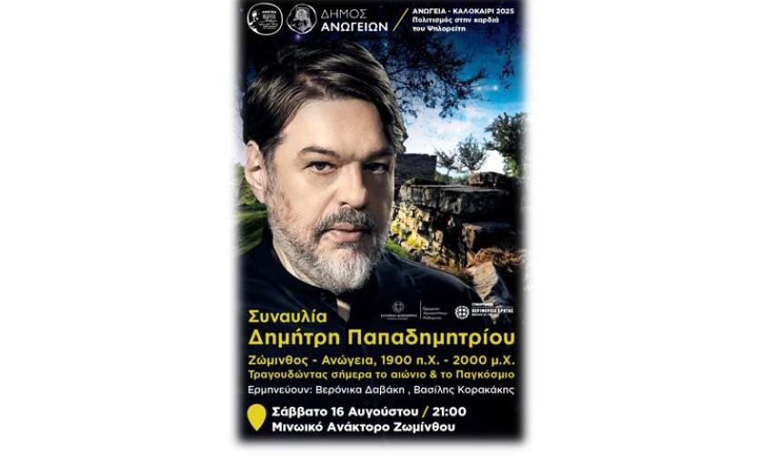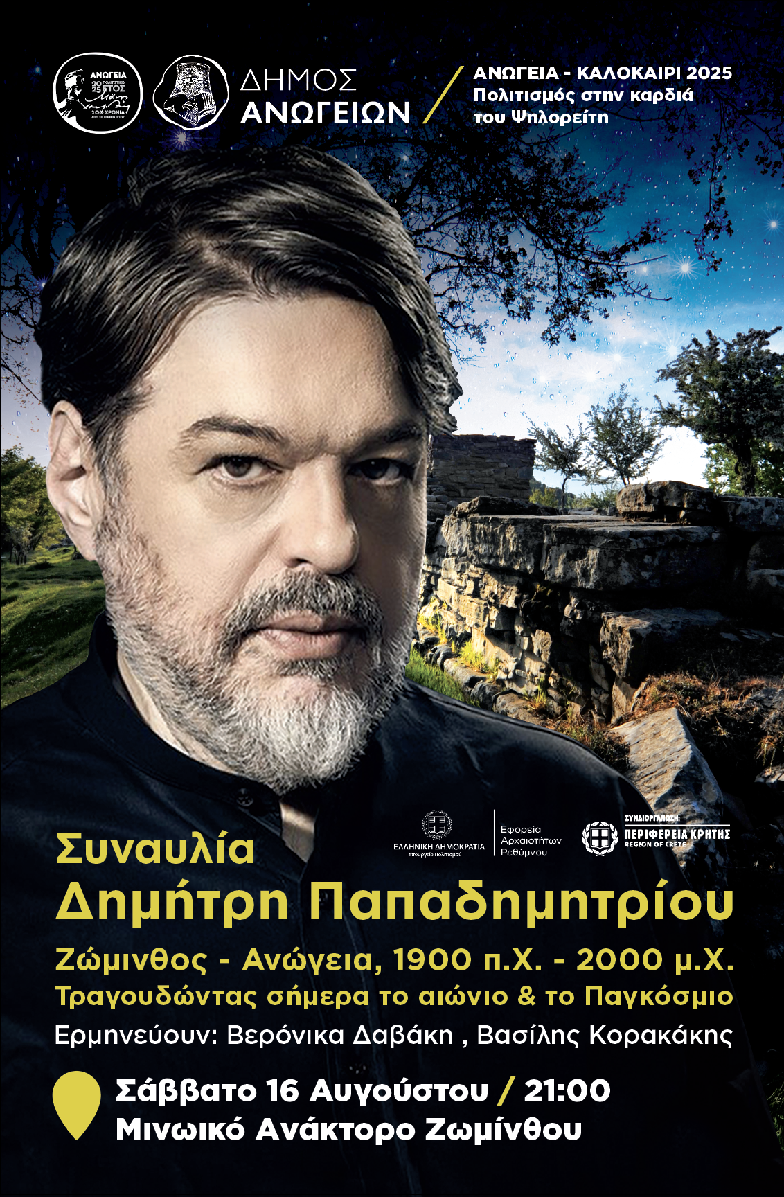 Το Σάββατο 16 Αυγούστου, στις 21:00, ο διακεκριμένος συνθέτης Δημήτρης Παπαδημητρίου, με έργο που έχει ταξιδέψει σε μεγάλες διεθνείς σκηνές και έχει τιμήσει στιγμές όπως οι Ολυμπιακοί Αγώνες, θα μας οδηγήσει σε ένα μουσικό ταξίδι εμπνευσμένο από τον Μινωικό Πολιτισμό και την ακατάλυτη αξία της πολιτιστικής μας κληρονομιάς.