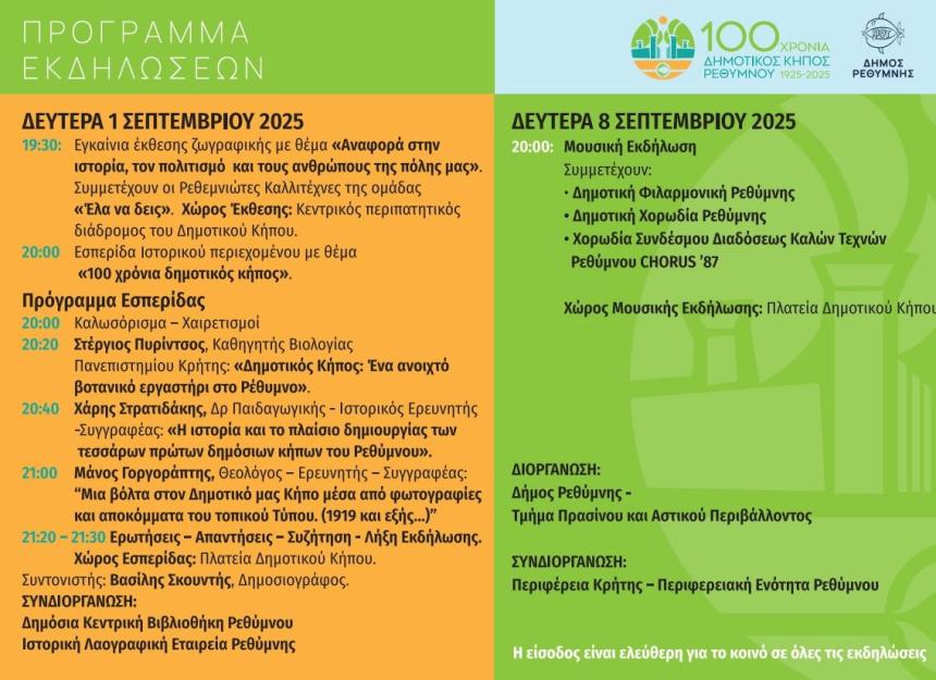 Ο Δήμος Ρεθύμνου προσκαλεί στις επετειακές εκδηλώσεις που διοργανώνει με την ευκαιρία της συμπλήρωσης 100 ετών από τη λειτουργία του Δημοτικού Κήπου Ρεθύμνου.