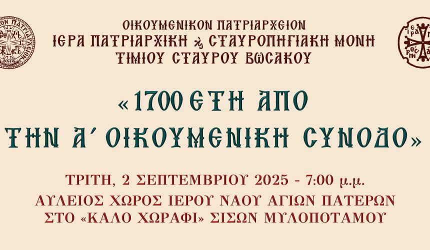 ΟΜΙΛΗΤΕΣ: α. Κωνσταντῆνος Γιαπιτσόγλου, Ἀρχαιολόγος: «Τό Μετόχι τῶν Ἁγίων Πατέρων τῆς Μονῆς Βωσάκου, στο Καλό Χωράφι Μυλοποτάμου». β. Δέσποινα Πετρουγάκη-Καλαϊτζαντωνάκη, PhD Βυζαντινῆς Φιλολογίας τοῦ Ἐργαστηρίου Παλαιογραφίας Τμήματος Φιλολογίας τοῦ Πανεπιστημίου Κρήτης: «Ή Α΄ Οίκουμενική Σύνοδος (325 μ.Χ.) καί ὁ ρόλος τοῦ Αὐτοκράτορα Κωνσταντίνου».
