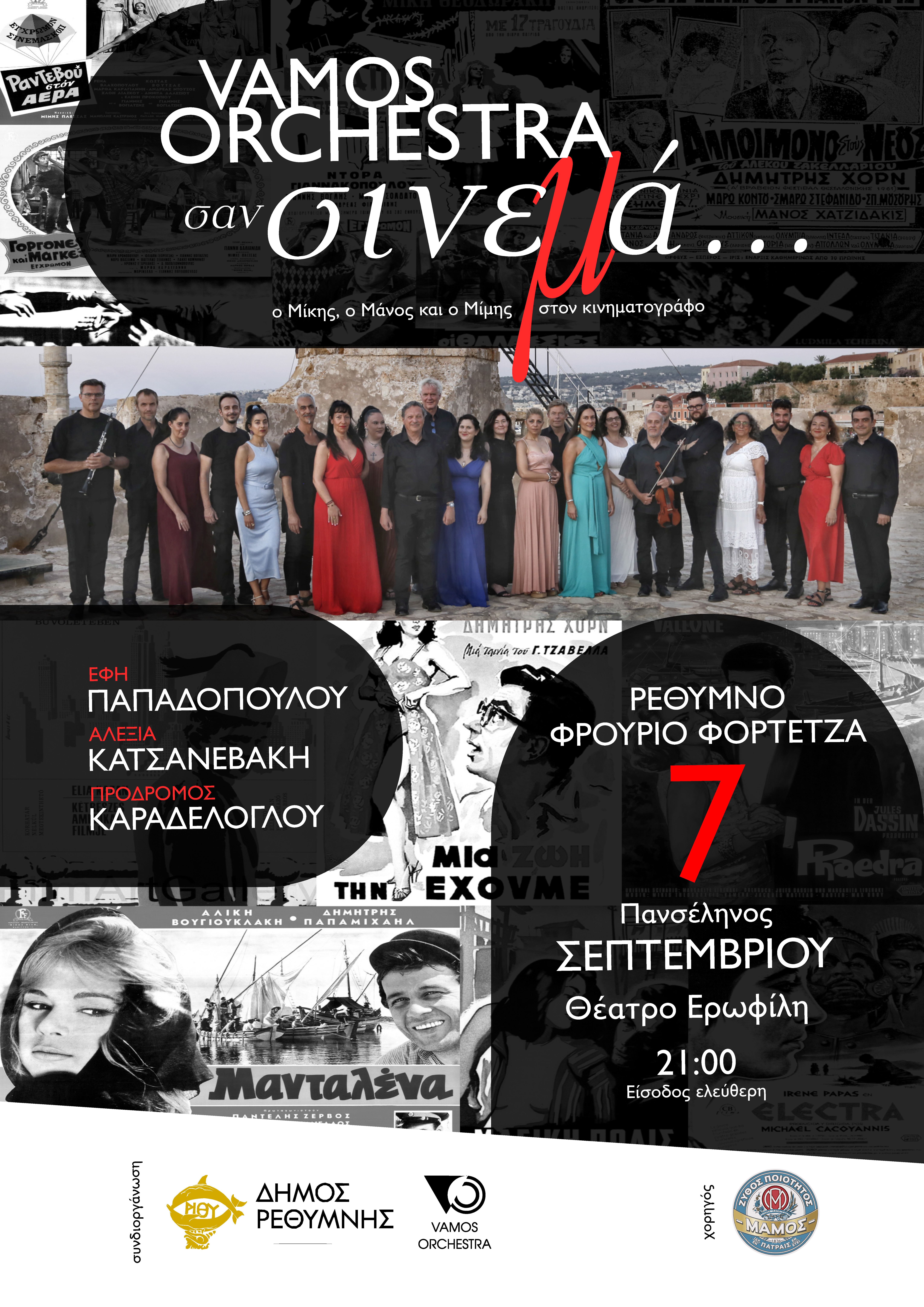Η Ορχήστρα Vamos θα μας ταξιδέψει νοσταλγικά στον χρόνο, ερμηνεύοντας πολυαγαπημένα θέματα και τραγούδια από τον Ελληνικό Κινηματογράφο που έχουν την υπογραφή των τριών αυτών σπουδαίων δημιουργών.