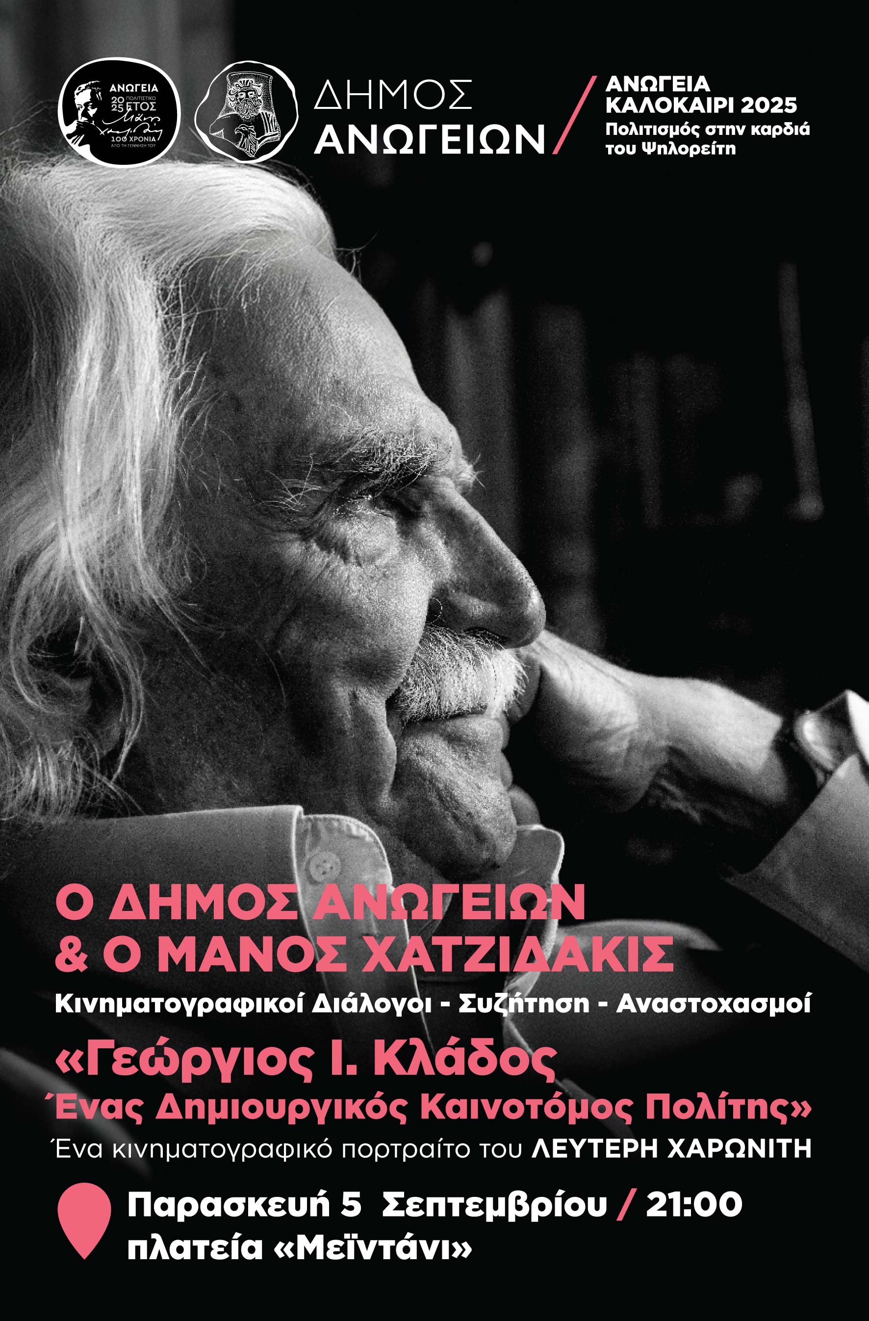 Ο Δήμος Ανωγείων έχει χαρακτηριστεί το 2025 ως Έτος Μάνου Χατζιδάκι, με αφορμή τα 100 χρόνια από τη γέννηση του κορυφαίου μουσικοσυνθέτη. Η βαθιά και διαχρονική σχέση του Μάνου Χατζιδάκι με τα Ανώγεια, που ξεκίνησε στα τέλη της δεκαετίας του ’70 και σφραγίστηκε με τις «Ανωγειανές Γιορτές», φέρει τη σφραγίδα της ποιότητας και της συνεργασίας του Χατζιδάκι με τον τότε εμβληματικό Δήμαρχο Γεώργιο Κλάδο.