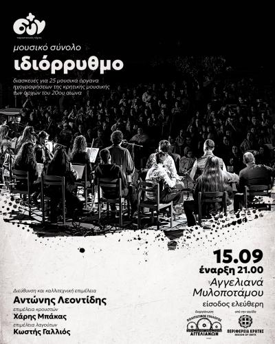 Το μουσικό σύνολο Ιδιόρρυθμο, υπό την καλλιτεχνική διεύθυνση και επιμέλεια του Αντώνη Λεοντίδη, παρουσιάζει μια μοναδική συναυλία τη Δευτέρα 15 Σεπτεμβρίου στα Αγγελιανά με πρόγραμμα αφιερωμένο στις ιστορικές ηχογραφήσεις της κρητικής μουσικής των αρχών του 20ού αιώνα.