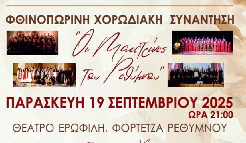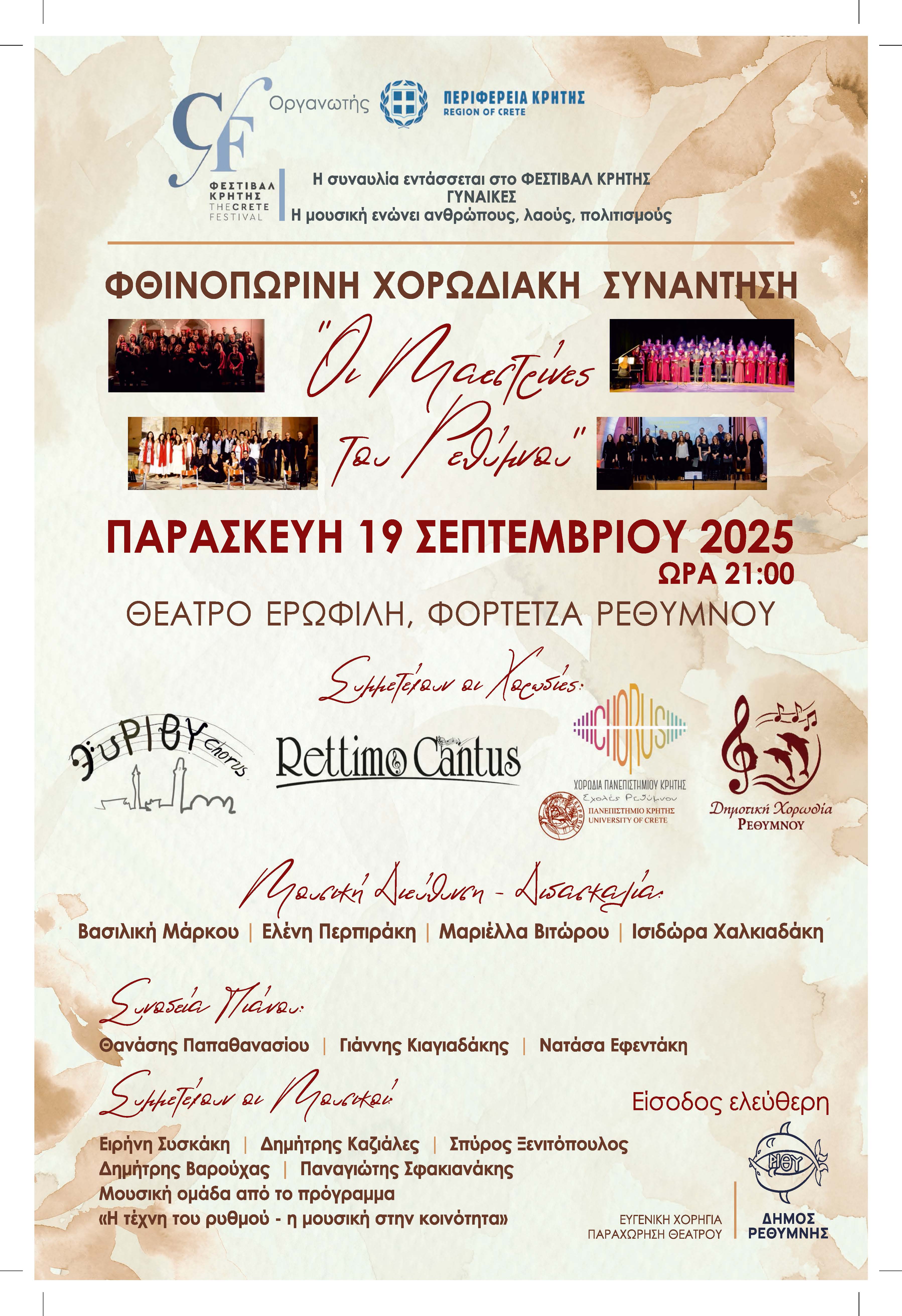 Στο πλαίσιο του Φεστιβάλ Κρήτης η Περιφέρεια Κρήτης διοργανώνει τη Φθινοπωρινή  Χορωδιακή  Συνάντηση  -   "Οι Μαεστρίνες του Ρεθύμνου"  την Παρασκευή 19 Σεπτεμβρίου 2025 στη Φορτέτζα Ρεθύμνου.