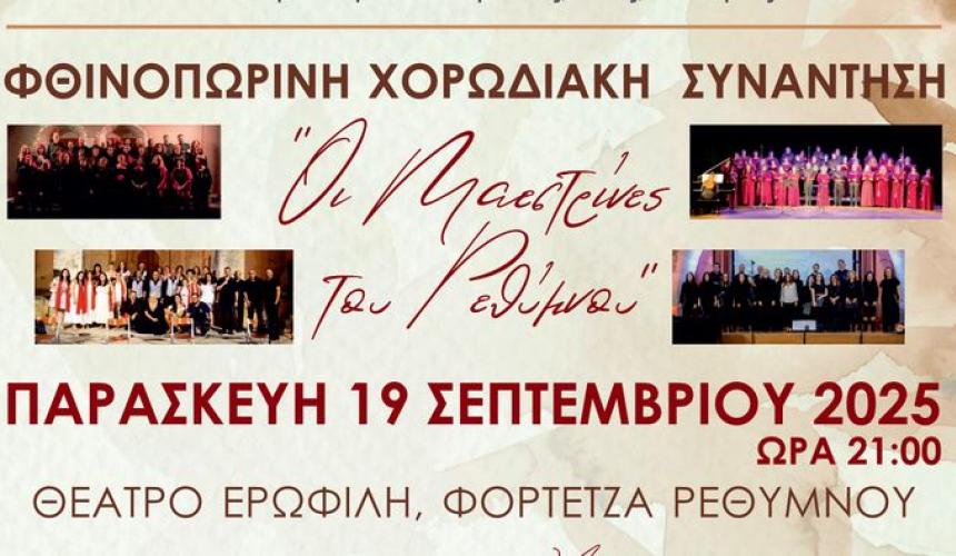 Στο πλαίσιο του Φεστιβάλ Κρήτης η Περιφέρεια Κρήτης διοργανώνει τη Φθινοπωρινή Χορωδιακή Συνάντηση - "Οι Μαεστρίνες του Ρεθύμνου" την Παρασκευή 19 Σεπτεμβρίου 2025 στη Φορτέτζα Ρεθύμνου.