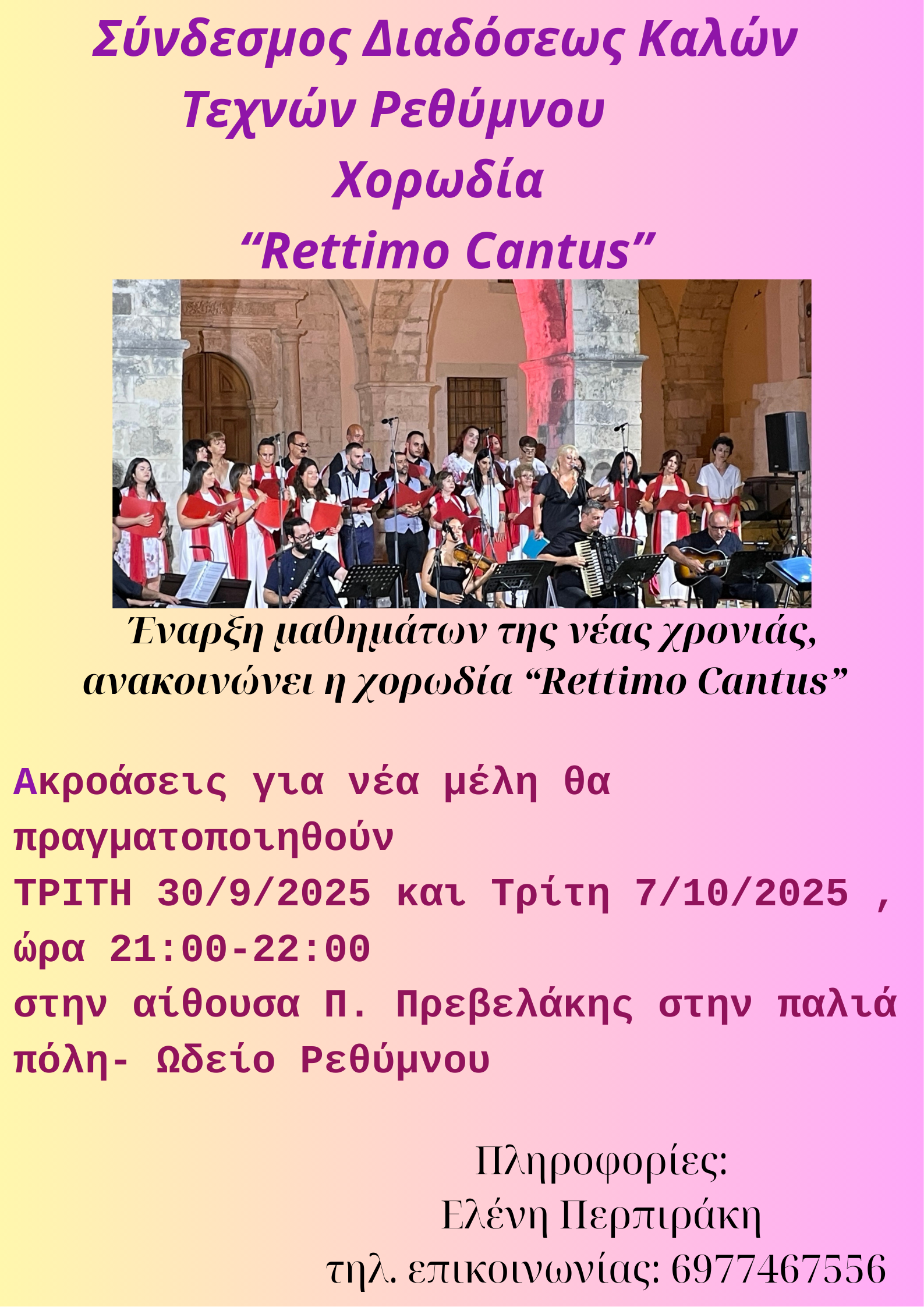 Η Χορωδία "Rettimo Cantus" του Συνδέσμου Διαδόσεως Καλών Τεχνών Ρεθύμνου αρχίζει τα μαθήματα για τη νέα χρονιά και καλεί για ακροάσεις και εγγραφές νέα μέλη που αγαπούν το τραγούδι και επιθυμούν να βελτιώσουν τις φωνητικές τους ικανότητες.