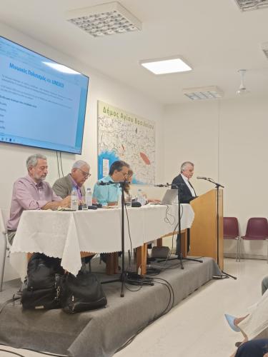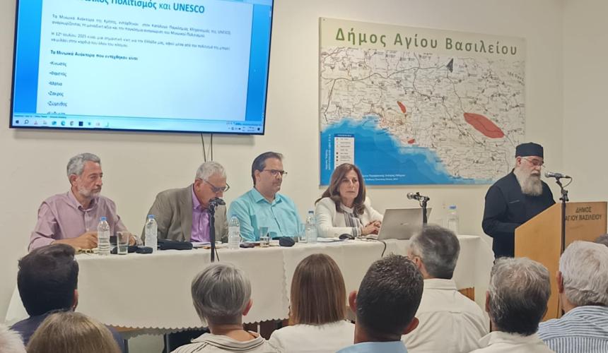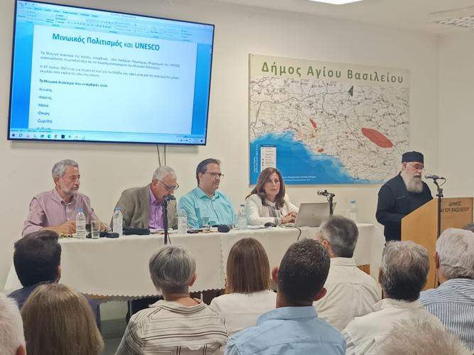 Στο χαιρετισμό του ο δήμαρχος Αγίου Βασιλείου κ. Γιάννης Ταταράκης υπογράμμισε, «ο Μινωικός Πολιτισμός αποτελεί ένα από τα θεμέλια της παγκόσμιας πολιτιστικής κληρονομιάς ενώ για εμάς τους Κρητικούς, συνιστά κι ένα ζωντανό στοιχείο της ταυτότητάς μας. Η ένταξη στον κατάλογο της UNESCO αναδεικνύει όχι μόνο τη σπουδαιότητα των μνημείων, αλλά και τη διαχρονική τους αξία ως σημείο αναφοράς για τον πολιτισμό, την ιστορία και τη συλλογική μνήμη.