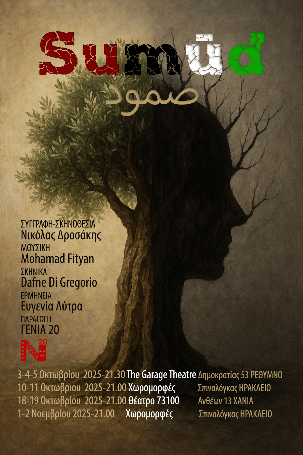 Το πρωτότυπο έργο του Νικόλα Δροσάκη ξεκινάει το ταξίδι του στην Κρήτη κάνοντας πρεμιέρα στο The Garage Theatre (Ρέθυμνο), για τρεις παραστάσεις. Με τη συνεργασία της Δάφνης Ντι Γκρεγκόριο στα σκηνικά, του σύριου σολίστα Mohamad Fityan στη μουσική της παράστασης και της ηθοποιού Ευγενίας Λύτρα, η Γενιά 20 ανοίγει στο θέατρο τη θεματική του αγώνα των παλαιστινίων.