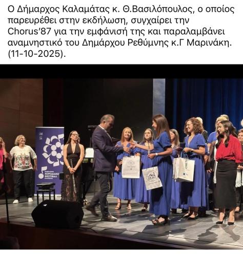 Εξαιρετική ήταν η παρουσία της Chorus ’87 στο 2ο Πανελλήνιο Χορωδιακό Φεστιβάλ Καλαμάτας που διοργάνωσε ο Δήμος Καλαμάτας σε συνεργασία με τις τοπικές χορωδίες «Αρμονία», «Ορφέας» και «Allegri» (10 – 12 Οκτωβρίου 2025).
