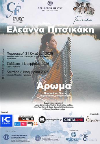 Στο πλαίσιο της παράλληλης δράσης του 5ου Φεστιβάλ Κρήτης «Γυναίκες», που υλοποιείται για 2η συνεχόμενη χρονιά, με την υποστήριξη του Αυτοτελούς Γραφείου Ισότητας της Περιφέρειας Κρήτης, η Ηρακλειώτισσα μουσικός Ελεάννα Πιτσικάκη, με σημαντική διεθνή πορεία, επιστρέφει στη γενέτειρά της για να παρουσιάσει τον πρώτο της προσωπικό δίσκο με τίτλο «ΑΡΩΜΑ».