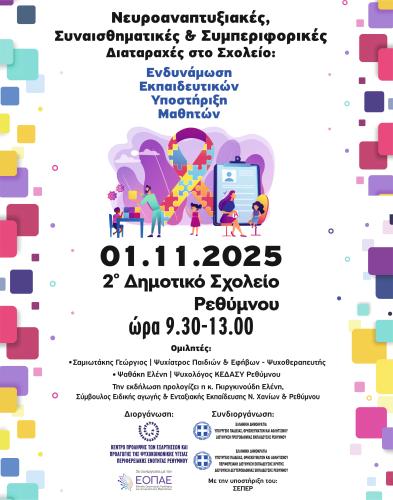 Το Κέντρο Πρόληψης των Εξαρτήσεων και Προαγωγής της Ψυχοκοινωνικής Υγείας Π.Ε. Ρεθύμνου, σε συνεργασία με τον ΕΟΠΑΕ, στο πλαίσιο των παρεμβάσεων του για την υποστήριξη της εκπαιδευτικής κοινότητας, συνδιοργανώνει με τις Διευθύνσεις της Α/θμιας και Β/θμιας Εκπαίδευσης και την υποστήριξη του ΣΕΠΕΡ, ημερίδα με θέμα «Νευροαναπτυξιακές, συμπεριφορικές και συναισθηματικές διαταραχές : Ενδυνάμωση εκπαιδευτικών - Υποστήριξη μαθητών».