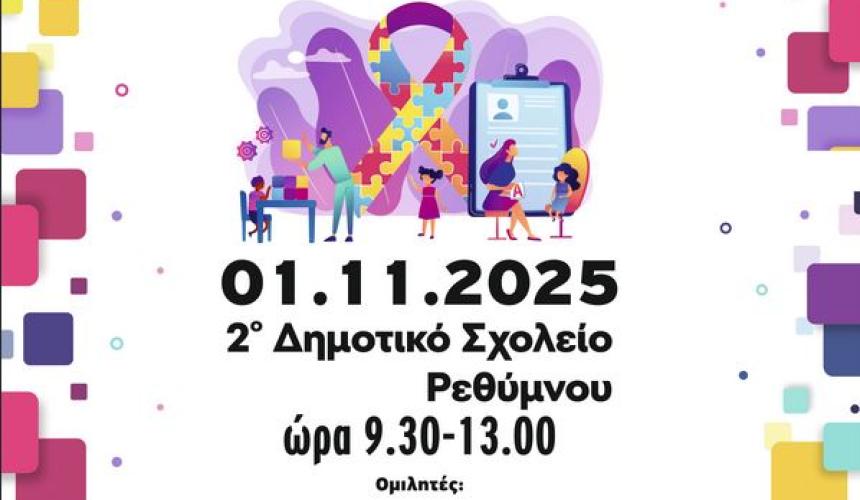 Η ημερίδα απευθύνεται σε εκπαιδευτικούς όλων των βαθμίδων και θα πραγματοποιηθεί το Σάββατο 1 Νοεμβρίου 2025, στις 09.30 – 13.00, στο αμφιθέατρο του 2ου Δ.Σ Ρεθύμνου.
