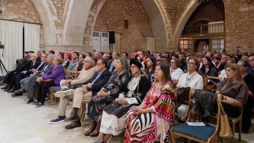 Το επιβλητικό Νερατζέ Τζαμί και η αίθουσα Παντελής Πρεβελάκης απετέλεσαν το ιδανικό σκηνικό για την ατμοσφαιρική εκδήλωση που κόσμησαν παραδοσιακές ενδυμασίες με την παρουσία μελών του Λαογραφικού Ομίλου Τζανιδάκη και του Λυκείου Ελληνίδων Ρεθύμνου. Κρητικές στολές φόρεσαν με περηφάνεια και οι κόρες του κου Μετζικώφ Ρωξάνη, σκηνοθέτης και Υακίνθη, γλύπτρια, που πλαισίωσαν τον πατέρα τους παραλαμβάνοντας και σηματοδοτώντας με ιδανικό τρόπο το νήμα της παράδοσης που περνά στις επόμενες γενιές.