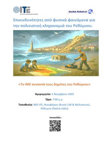 Με μια εξαιρετικά ενδιαφέρουσα εισήγηση με θέμα : "Επικινδυνότητες από φυσικά φαινόμενα για την πολιτιστική κληρονομιά του Ρεθύμνου" συνεχίζεται, τη Δευτέρα 3 Νοεμβρίου 2025, στις 7 μ.μ., ο κύκλος των ανοιχτών επιστημονικών ομιλιών που συνδιοργανώνουν ο Δήμος Ρεθύμνου και το Ινστιτούτο Μεσογειακών Σπουδών του Ιδρύματος Τεχνολογίας και Έρευνας (ΙΤΕ).
