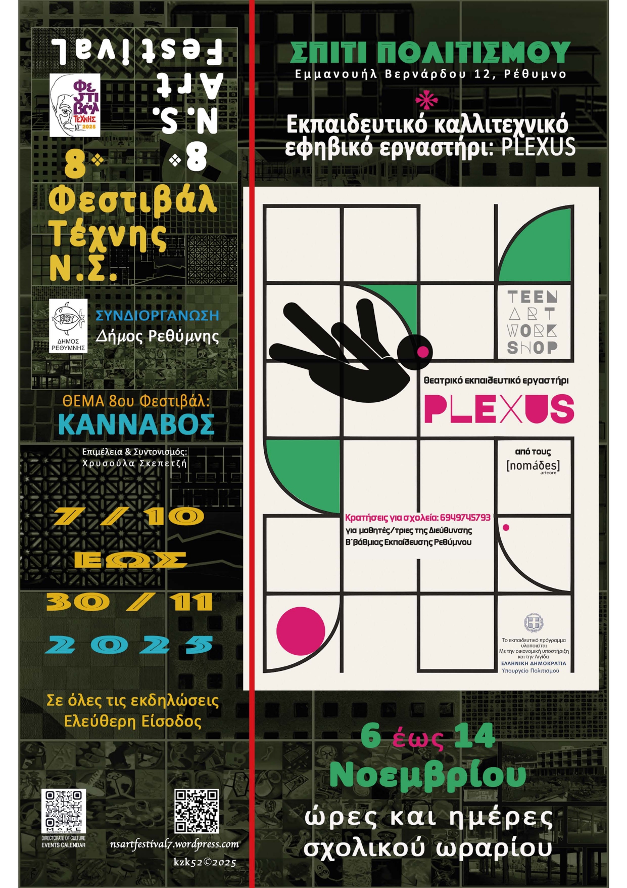 Το 8ο Φεστιβάλ Τέχνης Ν.Σ. 2025 (8o N.S. Art Festival 2025) σε συνδιοργάνωση με το Τμήμα Πολιτισμού του Δήμου Ρεθύμνης φιλοξενεί το καλλιτεχνικό εργαστήρι PLEXUS (Θεατρικό Εκπαιδευτικό εργαστήριο) από τους