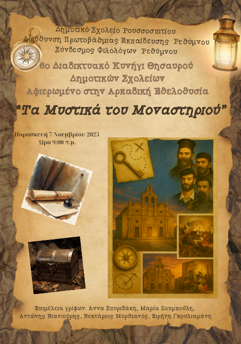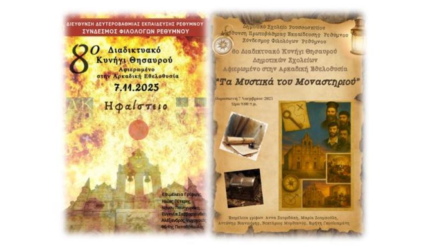 Την Παρασκευή 7 Νοεμβρίου 2025 πραγματοποιήθηκε το καθιερωμένο πλέον Διαδικτυακό Κυνήγι Θησαυρού για τους μαθητές Δημοτικών, Γυμνασίων και Λυκείων της Περιφερειακής Ενότητας Ρεθύμνου, που διοργάνωσε ο Σύνδεσμος Φιλολόγων Ρεθύμνου σε συνεργασία με τις Διευθύνσεις Πρωτοβάθμιας και Δευτεροβάθμιας Εκπαίδευσης Ρεθύμνου και την αρωγή της Ι.Μ. Ρεθύμνης και Αυλοποτάμου, της Περιφερειακής Ενότητας Ρεθύμνου και όλων των Δήμων της Π.Ε. Ρεθύμνου, στο πλαίσιο των εορταστικών εκδηλώσεων για τα 159 χρόνια από την Αρκαδική Εθελοθυσία. Ως φόρο τιμής στην επέτειο δημιουργίας τους, ορισμένοι γρίφοι αναφέρονταν στη Δημόσια Κεντρική Βιβλιοθήκη Ρεθύμνου, η οποία συμπληρώνει φέτος 80 χρόνια λειτουργίας, καθώς και στην Κρήνη Ριμόντι, με αφορμή τα 400 χρόνια που συμπληρώνονται το 2026 από την οικοδόμησή της. Ο αριθμός των μαθητών που έλαβαν μέρος τη φετινή χρονιά ξεπέρασε κάθε προηγούμενο!