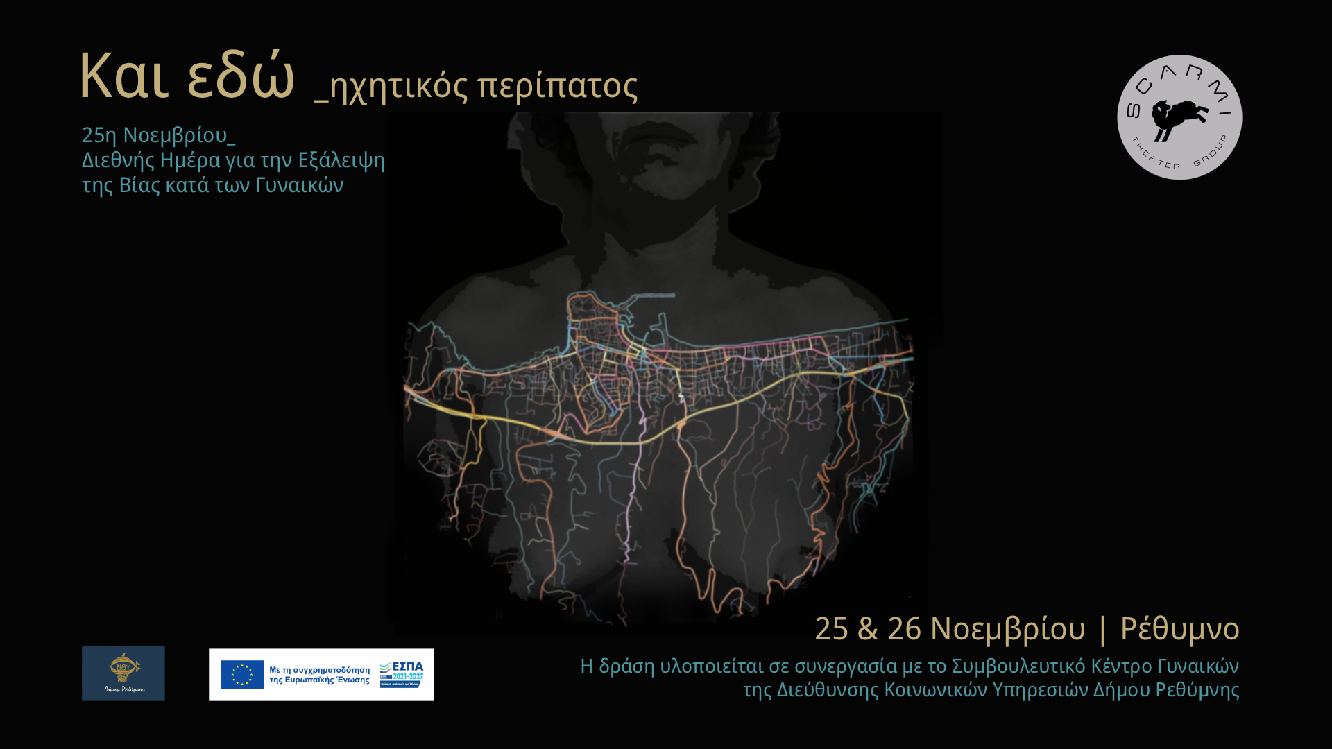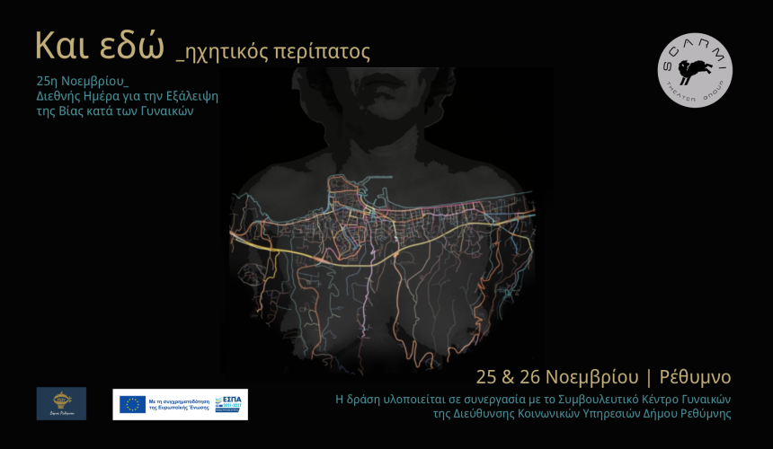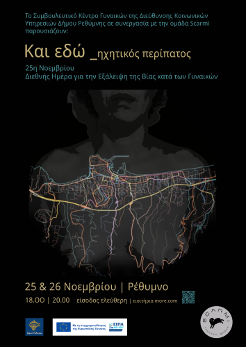 Το Συμβουλευτικό Κέντρο Γυναικών της Διεύθυνσης Κοινωνικών Υπηρεσιών Δήμου Ρεθύμνης σε συνεργασία με την Ομάδα Scarmi, παρουσιάζουν το έργο «Και Εδώ», έναν ηχητικό μουσικό αφηγηματικό περίπατο, που επιδιώκει να φωτίσει τις αόρατες τοπογραφίες της έμφυλης βίας στον δημόσιο χώρο της πόλης μας.