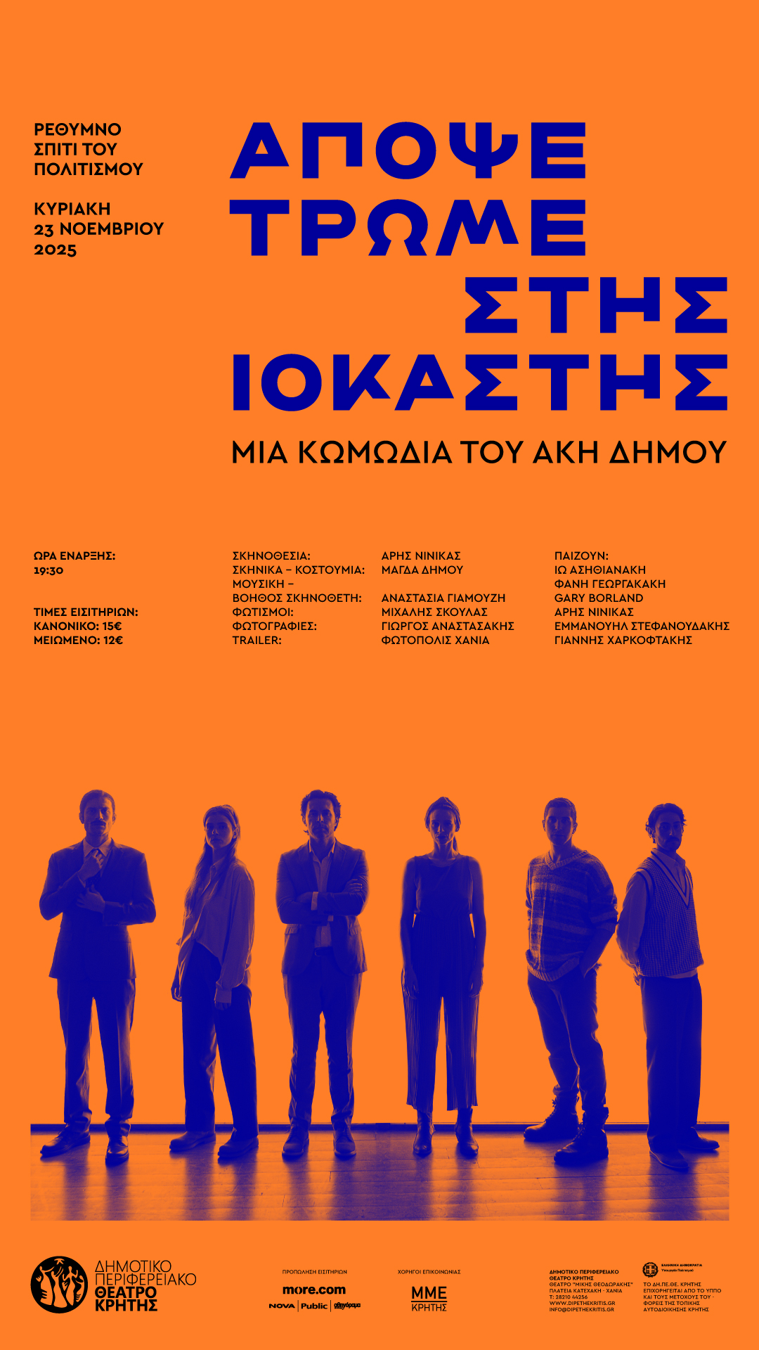 Το Δημοτικό Περιφερειακό Θέατρο Κρήτης παρουσιάζει την εκρηκτική κωμωδία του Άκη Δήμου «Απόψε τρώμε στης Ιοκάστης» σε σκηνοθεσία Άρη Νινίκα. Πρόκειται για ένα από τα κορυφαία έργα της σύγχρονης ελληνικής δραματουργίας, το οποίο έκανε πρεμιέρα στα Χανιά, στο θέατρο «Μίκης Θεοδωράκης» στις 7 Νοεμβρίου και στη συνέχεια θα περιοδεύσει σε όλη την Κρήτη.