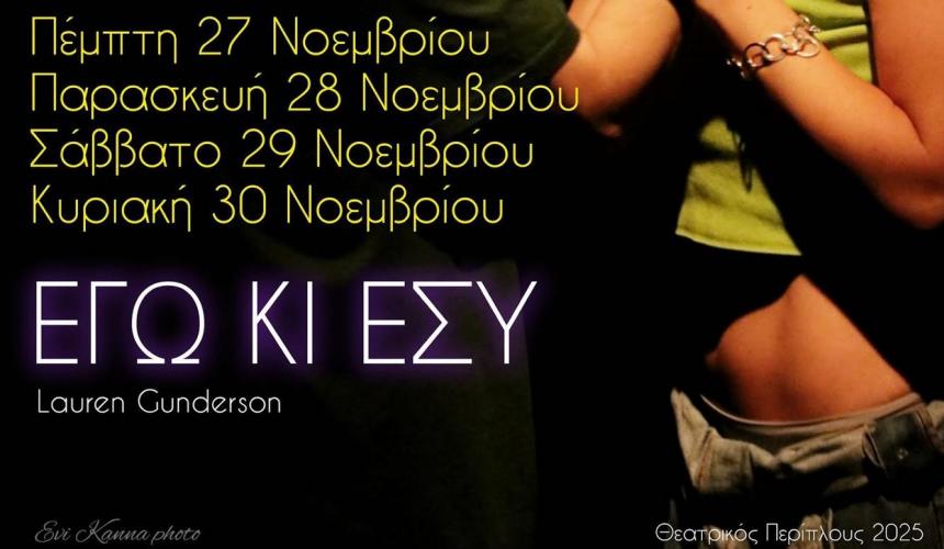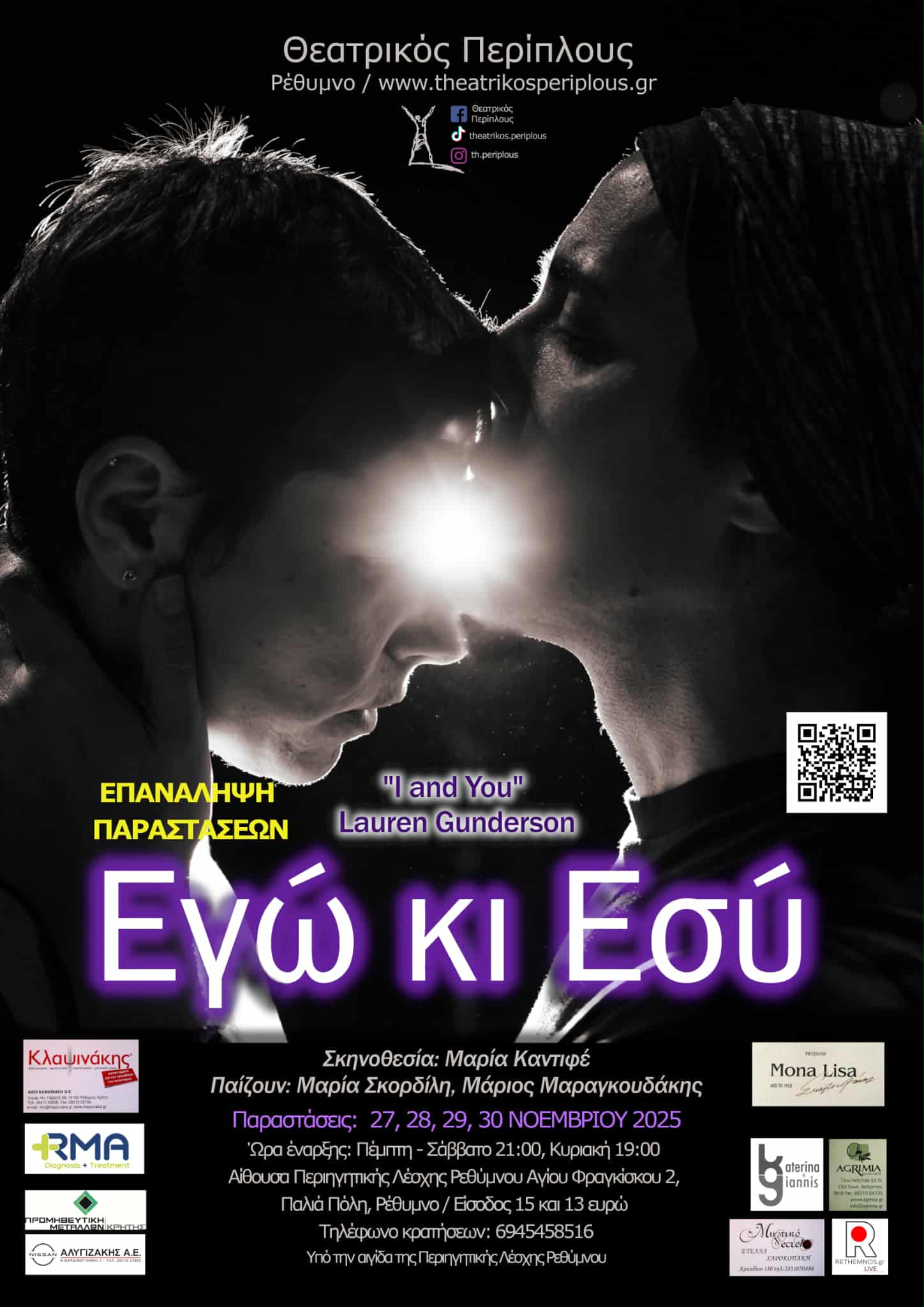 Το τρυφερό και βαθιά ανθρώπινο «Εγώ κι Εσύ» επιστρέφει από την Πέμπτη 27 Νοεμβρίου για ένα νέο, περιορισμένο κύκλο παραστάσεων στην αίθουσα της Περιηγητικής Λέσχης Ρεθύμνου σε σκηνοθεσία Μαρίας Καντιφέ.