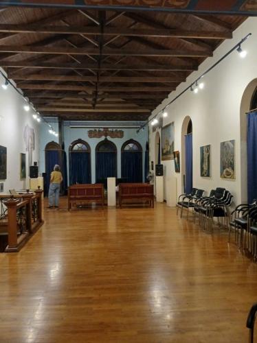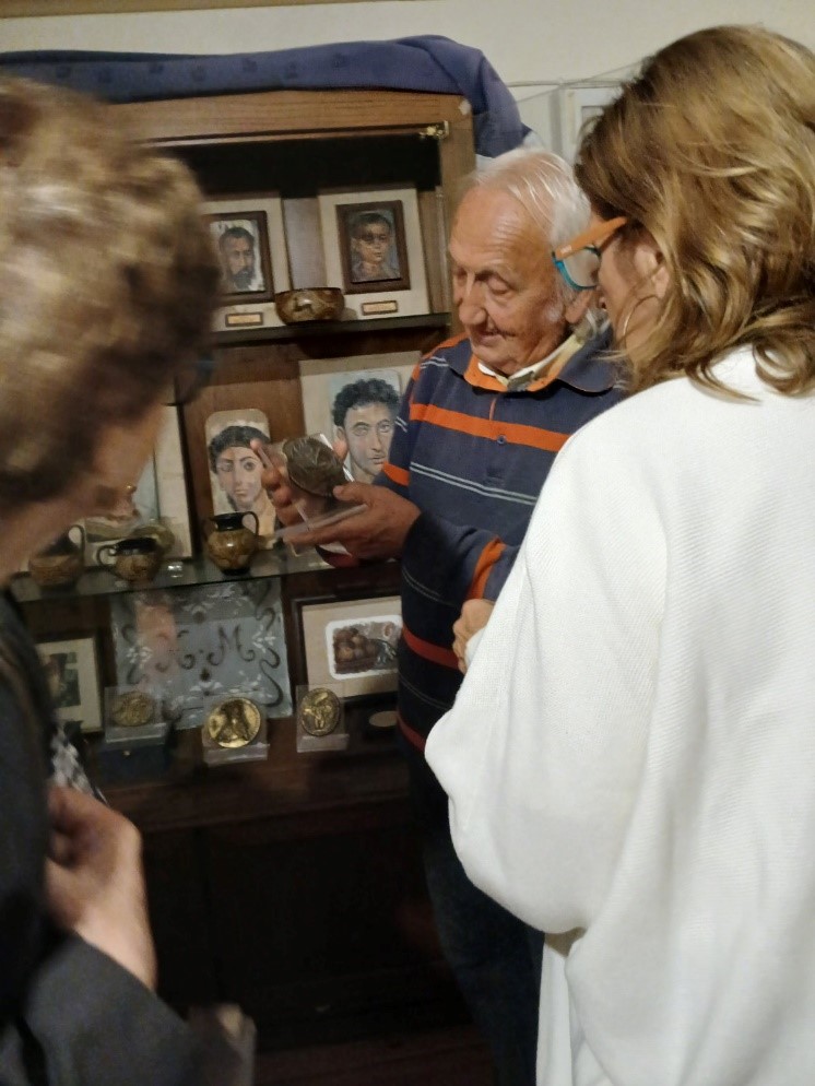 Ο κ. Κουνδουράκης, διευθυντής του Κέντρου μας ξενάγησε και μας μίλησε για την ιστορία του χώρου, τη δουλειά του, για τα έργα του που αποτελούν και τη μόνιμη συλλογή του Κέντρου. Πρόθυμος απάντησε σε όλα τα ερωτήματα που του θέσαμε. Μας μίλησε με ενθουσιασμό για τη γνωριμία του με άλλους σημαντικούς ζωγράφους προγενέστερους ή και σύγχρονους του, για το αποτύπωμά του που γράφει πολλά χρόνια στο χώρο της ζωγραφικής, της αγιογραφίας και όχι μόνο, για την έκθεση που ετοιμάζει την περίοδο αυτή και η οποία θα παρουσιαστεί προσεχώς σε πολύ σημαντικό χώρο των Αθηνών. Ο κ. Κουνδουράκης μας προσκάλεσε να απολαύσουμε τη θέα -και όχι μόνο –από την ταράτσα, μια από τις επόμενες ημέρες, όπως και έγινε, όπου «γευτήκαμε» την φιλόξενη υποδοχή και της συζύγου του, κας Ασπασίας Πολοπετράκη. Ομολογούμε πως εκτός από τα ειδικής βαρύτητας έργα της μόνιμης συλλογής του καλλιτέχνη που είδαμε, μας εντυπωσίασε και ο ίδιος ο χώρος του Κέντρου Βυζαντινών Τεχνών όπου εκτίθενται. Πρόκειται συνολικά για ένα αναπαλαιωμένο βενετσιάνικο αρχοντικό «κρυμμένο» στη καρδιά της πόλης του Ρεθύμνου, επισκέψιμο, δίπλα σε άλλα μνημεία της πόλης. Το Κέντρο βρίσκεται πολύ κοντά στην πλατεία Μικρασιατών όπου βρίσκεται μνημείο για την Μικρασιατική Καταστροφή, που μελέτησε και σχεδίασε ο κ. Μανώλης Κουνδουράκης και κατασκευάστηκε από τον γλύπτη κ. Χαράλαμπο Νεονάκη. Στο σημαντικό μνημείο αυτό μας οδήγησε και μας ξενάγησε ο ίδιος ο κ. Μανώλης Κουνδρουράκης, όπου και ολοκληρώθηκε ο μεστός εμπειριών περίπατός μας.