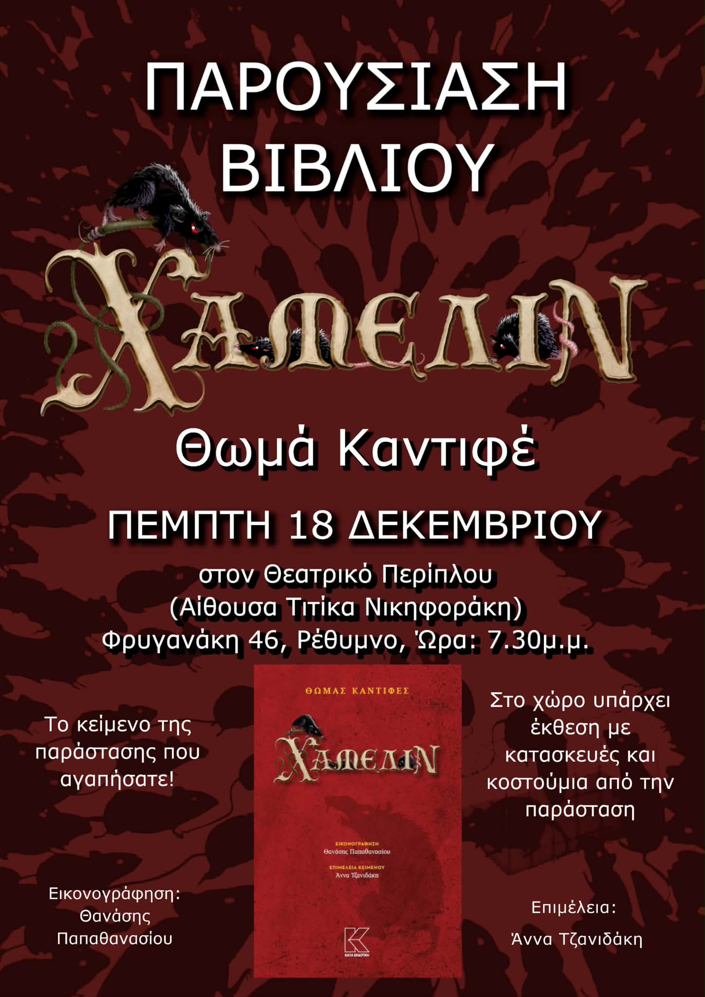 Παράλληλα, το φουαγιέ του θεάτρου έχει μετατραπεί σε μια μοναδική έκθεση με τα σκηνικά και τα κουστούμια της παράστασης που λάτρεψαν μικροί και μεγάλοι. Φροντισμένες κατασκευές που έφτιαξε ο ίδιος ο θίασος με την καθοδήγηση του Θανάση Παπαθανασίου, για τις ανάγκες της παράστασης, τα κουστούμια του Μάγου Αυλητή και του Δημάρχου, τα… ποντίκια του Χάμελιν και φυσικά η ομάδα του Θεατρικού Περίπλου θα υποδεχτεί το κοινό σ’ αυτή τη μεγάλη θεατρική γιορτή!