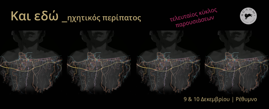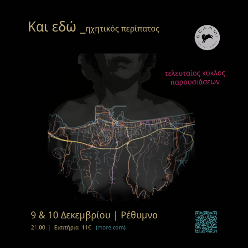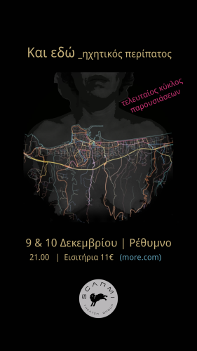 Η ομάδα Scarmi επιστρέφει με έναν 3ο και τελευταίο κύκλο παρουσιάσεων και σας προσκαλεί σε έναν ηχητικό, μουσικό, αφηγηματικό περίπατο που επιχειρεί να φωτίσει τις αόρατες τοπογραφίες της έμφυλης βίας στον δημόσιο χώρο της πόλης του Ρεθύμνου.