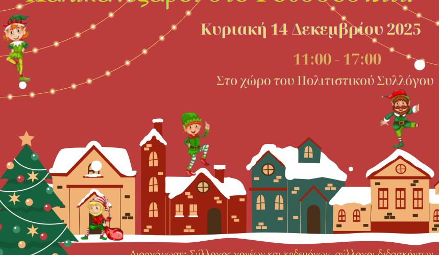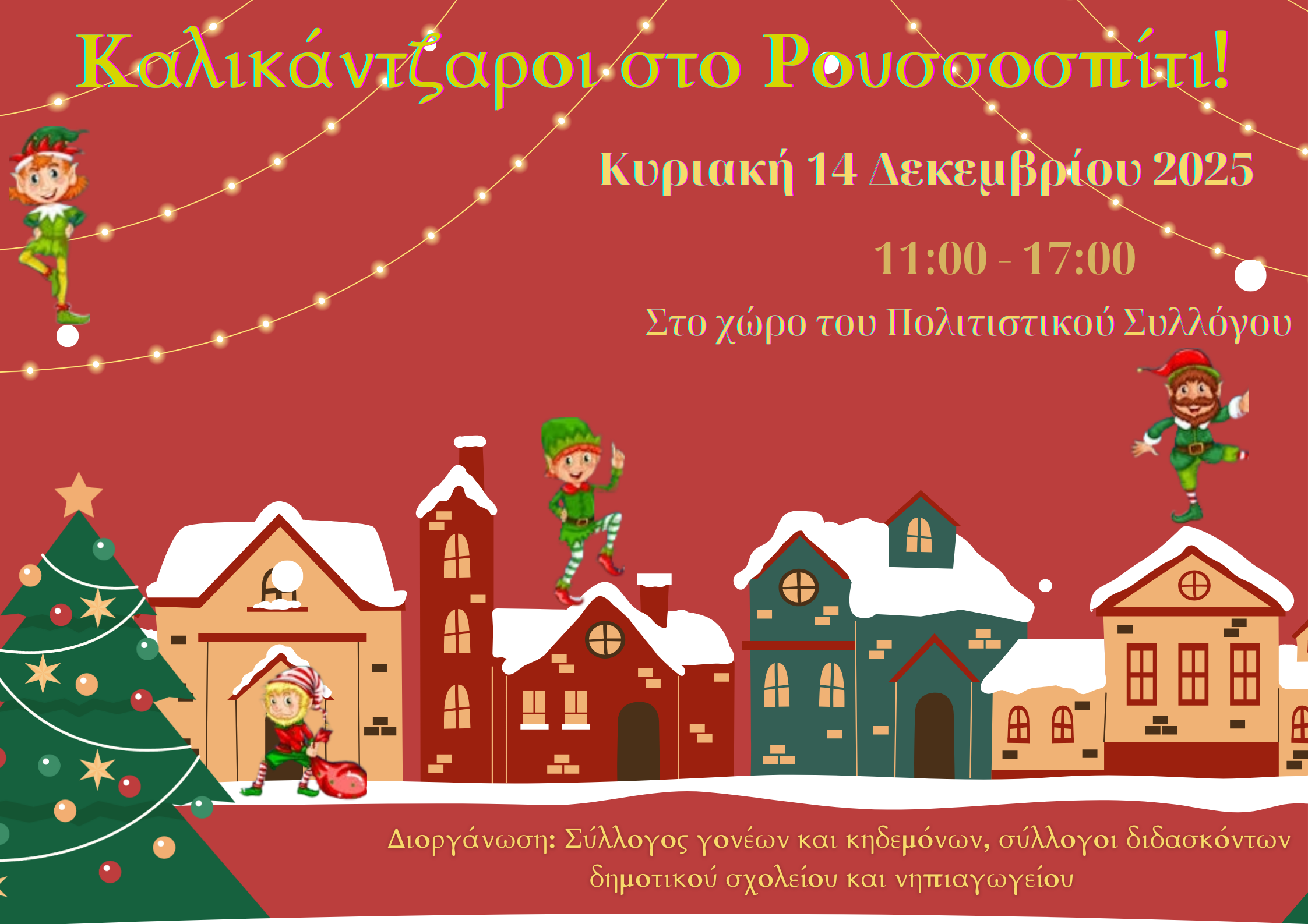 Ο Σύλλογος Γονέων και Κηδεμόνων του δημοτικού σχολείου και του νηπιαγωγείου Ρουσσοσπιτίου μαζί με τους συλλόγους διδασκόντων, δημιουργούν ένα όμορφο και λαμπερό καλικαντζαροχωριό, στο χώρο του Πολιτιστικού συλλόγου,την Κυριακή 14 Δεκεμβρίου.