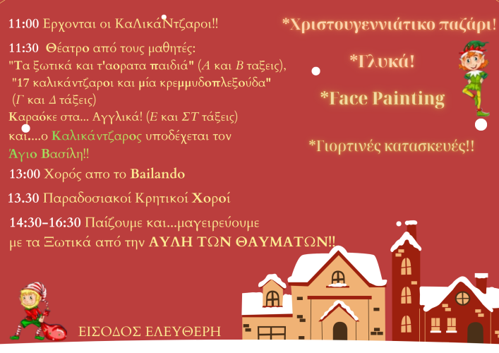 * Θέατρο, τραγούδια, face painting, χριστουγεννιάτικες κατασκευές, δώρα από τον Άγιο Βασίλη!