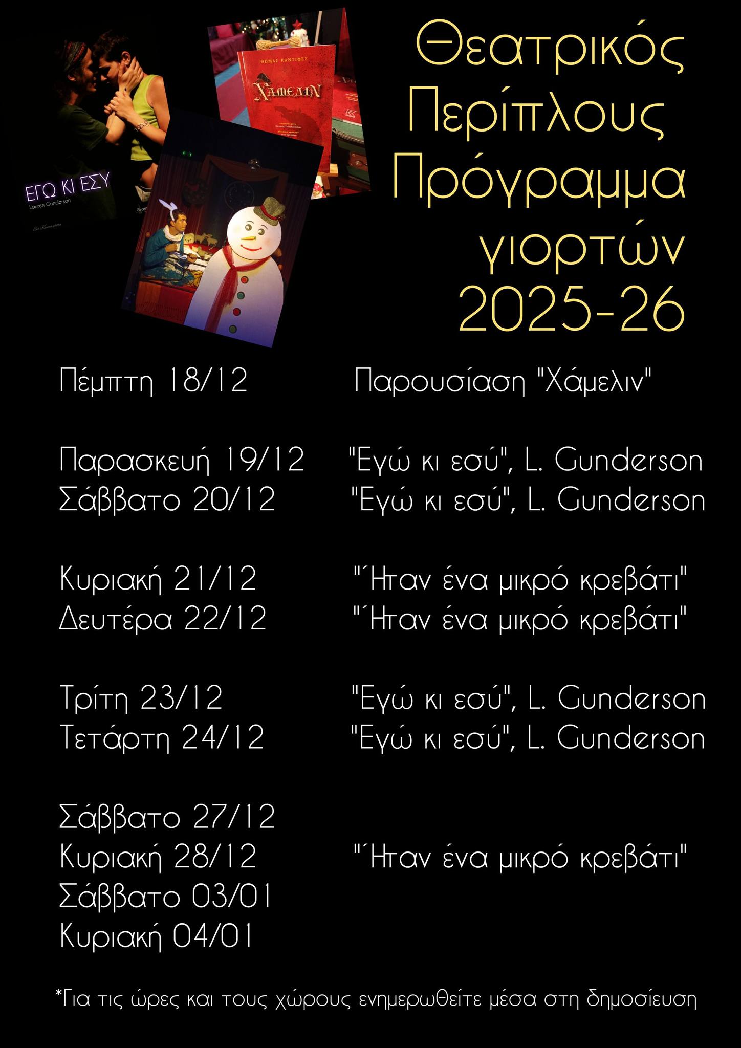 Ώρες έναρξης: 21.00 (εκτός από την Τετάρτη 24/12 που η παράσταση ξεκινά στις 19.30) στην Αίθουσα Περιηγητικής Λέσχης Ρεθύμνου (Αγ. Φραγκίσκου 2, παλιά πόλη)