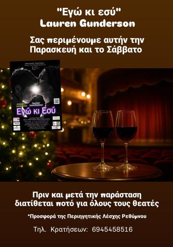 Περιορισμένες θέσεις για την Παραμονή των Χριστουγέννων. Παρακαλούμε το κοινό να κλείσει τις θέσεις του το συντομότερο! Πριν και μετά την παράσταση προσφέρεται ποτό για όλους τους θεατές από την Περιηγητική Λέσχη Ρεθύμνου.