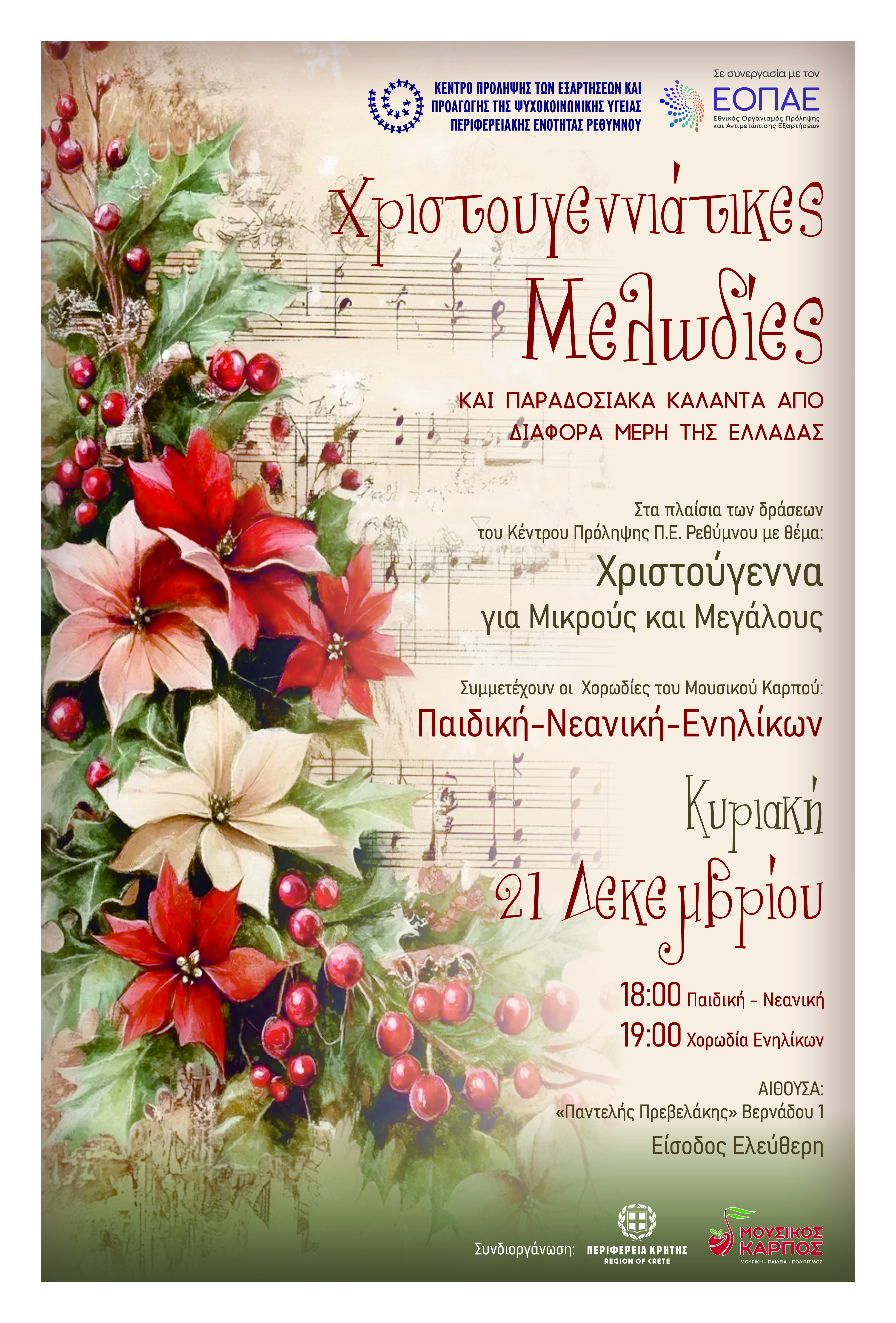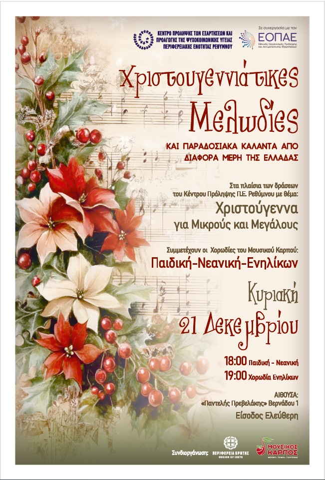 Η πόλη του Ρεθύμνου θα γεμίσει με τις πιο γλυκές χριστουγεννιάτικες μελωδίες, μέσα από μια ξεχωριστή εκδήλωση που διοργανώνει ο Μουσικός Καρπός, σε συνδιοργάνωση με την Περιφέρεια Κρήτης, το Κέντρο Πρόληψης Ρεθύμνου και τον Εθνικό Οργανισμό Πρόληψης και Αντιμετώπισης Εξαρτήσεων που θα πραγματοποιηθεί την Κυριακή 21 Δεκεμβρίου, στις 18:00 με τη συμμετοχή της Παιδικής – Νεανικής Χορωδίας και στις 19:00 με τη συμμετοχή της Χορωδίας Ενηλίκων του Μουσικού Καρπού, στην αίθουσα «Παντελής Πρεβελάκης», Βερνάδου 1. Είσοδος ελεύθερη.
