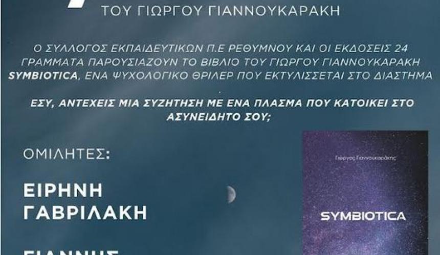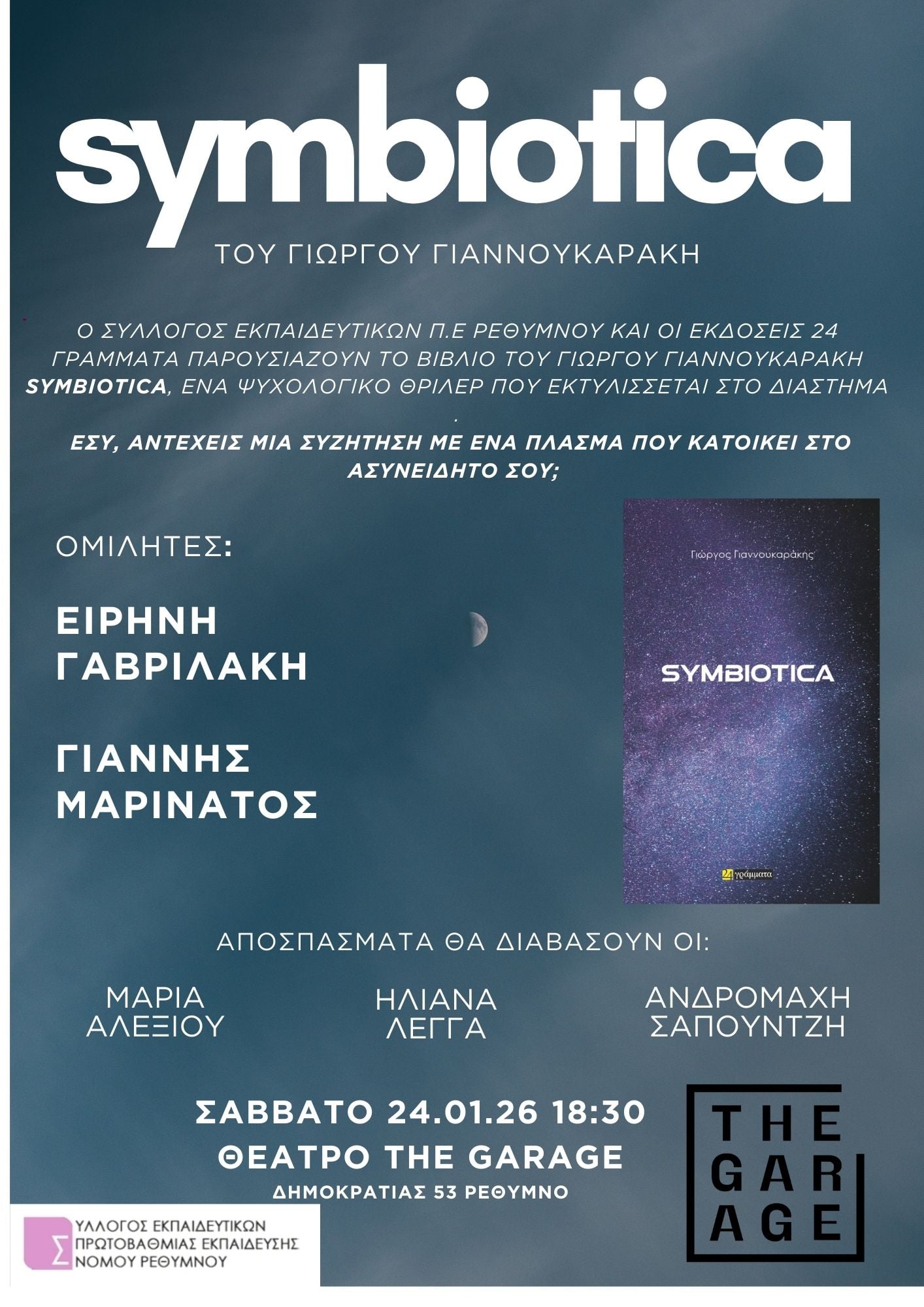 Ο Σύλλογος Εκπαιδευτικών Π.Ε Ρεθύμνου και οι εκδόσεις 24 Γράμματα παρουσιάζουν το νέο βιβλίο του Γιώργου Γιαννουκαράκη, με τίτλο Symbiotica, στο The Garage Theatre στο Ρέθυμνο, το Σάββατο 24-1-2026 στις 18:30.
