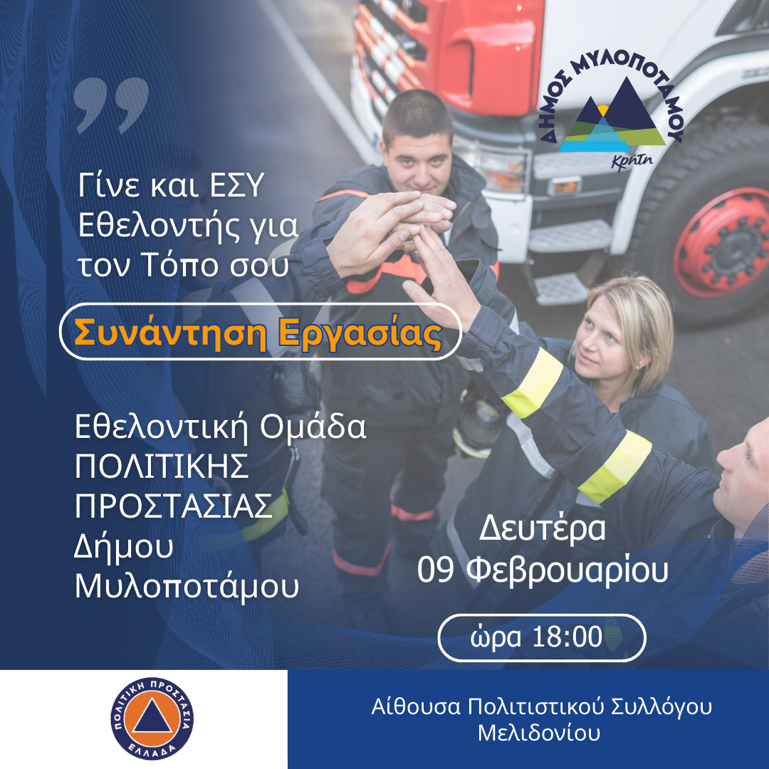 Ο Δήμος Μυλοποτάμου προχωρά σε ένα ουσιαστικό βήμα ενίσχυσης της πρόληψης και της ετοιμότητας απέναντι σε έκτακτα φαινόμενα, ξεκινώντας τη διαδικασία δημιουργίας πιστοποιημένης Εθελοντικής Ομάδας Πολιτικής Προστασίας.