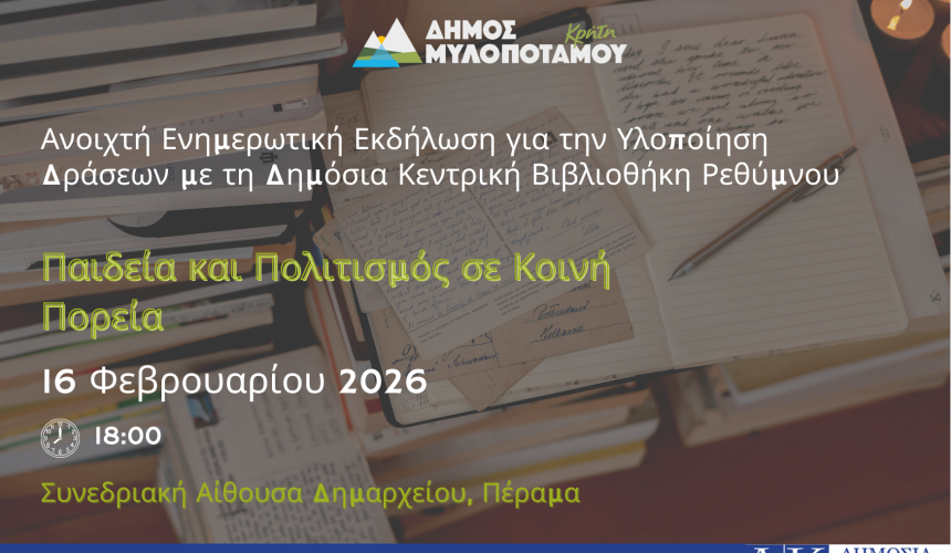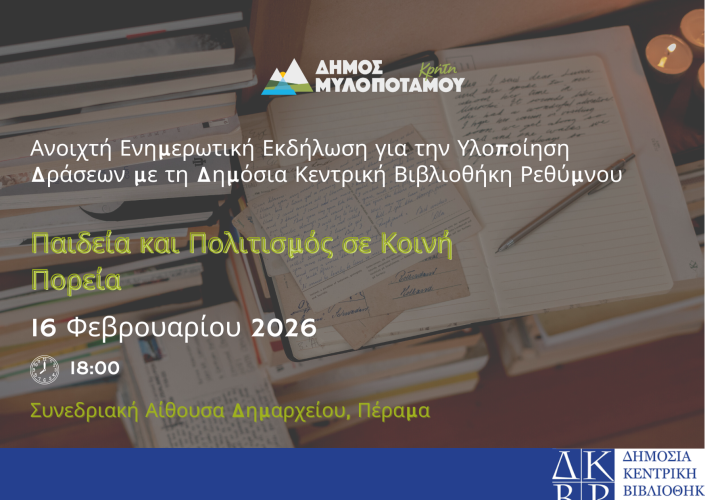 Στο πλαίσιο του Μνημονίου Συνεργασίας που έχει υπογραφεί μεταξύ του Δήμου Μυλοποτάμου και της Δημόσια Κεντρική Βιβλιοθήκη Ρεθύμνου, διοργανώνεται ανοιχτή εκδήλωση ενημέρωσης για τις κοινές δράσεις που θα υλοποιηθούν το επόμενο διάστημα στον τομέα του βιβλίου, της παιδείας και του πολιτισμού.