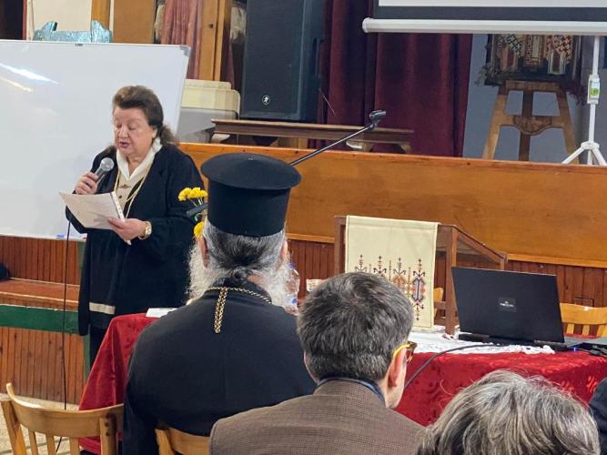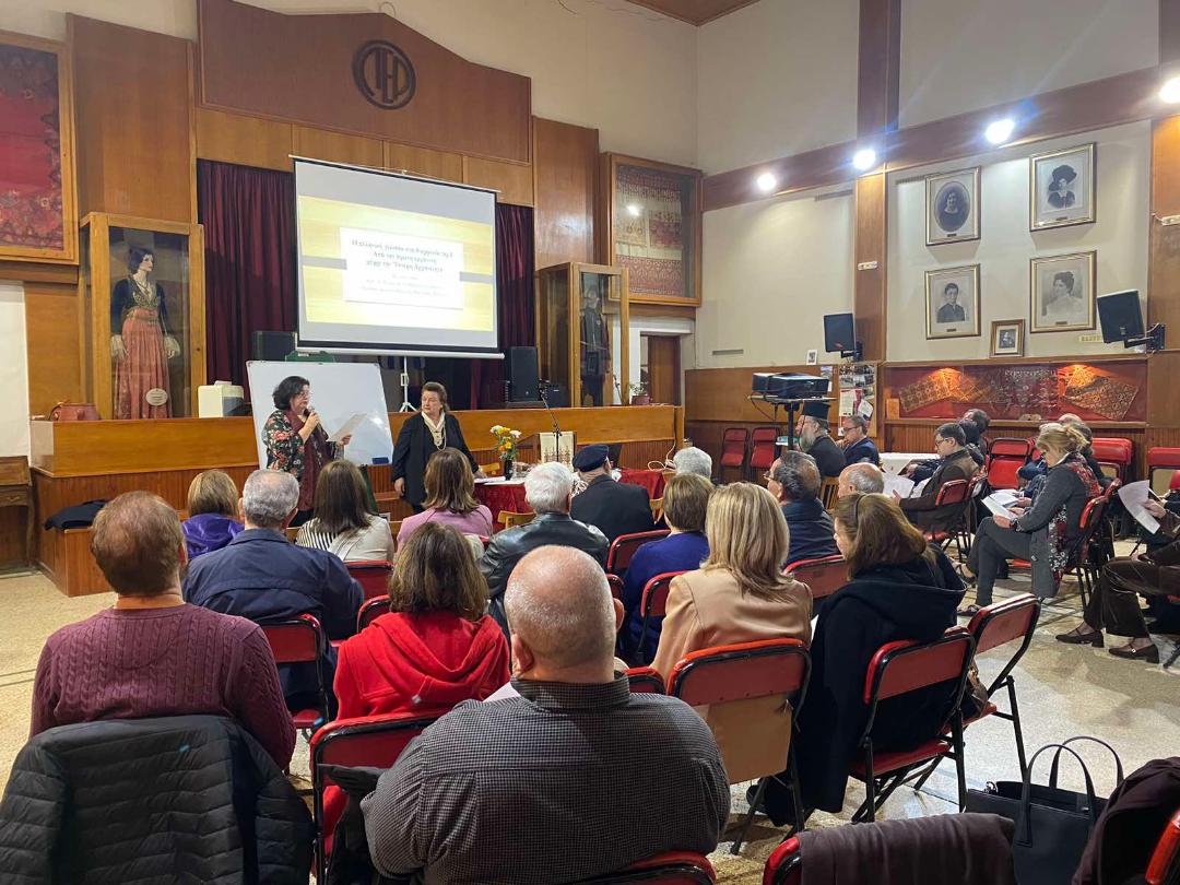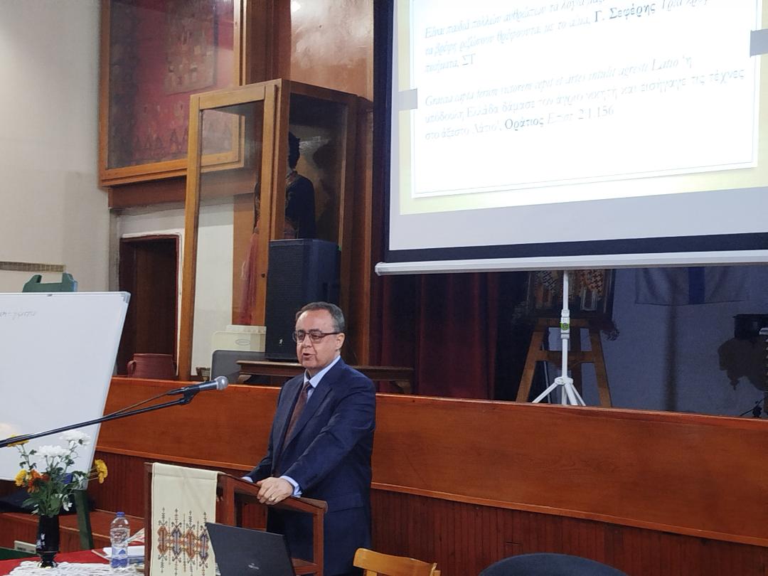 Στη συνέχεια, η κ.ΤασούλαΔρανδάκη-Μαρινάκη, μέλος του Δ.Σ., παρουσίασε τον ομιλητή ο οποίος ξεκίνησε με τα λόγια του ποιητή μας Γεωργίου Σεφέρη: «Είναι παιδιά πολλών ανθρώπων τα λόγια μας. Σπέρνουνται, γεννιούνται σαν τα βρέφη. Ριζώνουν θρέφουνται με το αίμα…» και του Λατίνου ποιητή Ορατίου: «.Η υπόδουλη (στους Ρωμαίους) Ελλάδα, δάμασε τον άγριο νικητή και εισήγαγε τις τέχνες στο άξεστο Λάτιο».Ο ομιλητής, συνέχισε την αναφορά στην εξέλιξη της γλώσσας με έξυπνα επιλεγμένα κείμενα αρχίζοντας από τον Όμηρο του 8ουαι. π.Χ. με αποσπάσματα από Ιλιάδα και Οδύσσεια, προχώρησε σεπρωιμότερες έμμετρες επιγραφές του 740π.Χ. μία χαραγμένη πάνω σε αγγείο που δόθηκε σαν βραβείο στον καλύτερο και πιο επιδέξιο χορευτή και η οποία βρέθηκε στον Κεραμεικό και μία από την Κάτω Ιταλία, χαραγμένη σε ποτέριον (ποτήρι) που δίνει την χαρά της Αφροδίτης. Ακολούθησε η περίφημη ποιήτρια Σαπφώ του 7ου π.Χ. με στίχους της για τον έρωτα που λύνει τα μέλη (λυσιμέλης), δονεί , είναι γλυκύπικροναμάχανον (αμάχητο) όρπετον (ερπετό) και ο Ηρόδοτος, 5οαι.π.Χ., ο οποίος σήμερα θεωρείται ως πατέρας της Ιστορίας και που στο κείμενο αυτό, αναφέρει τι είναι Ιστορία και τον σκοπό της.