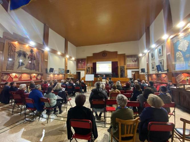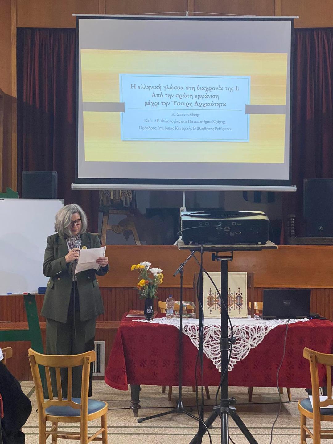 Το ενδιαφέρον έντονο και σταθερό καθ’όλη την διάρκεια της παραστατικότατης ομιλίας του κ.Κώστα Σπανουδάκη, καθηγητή Αρχαίας Ελληνικής Φιλολογίας του Πανεπιστημίου Κρήτης και προέδρου του Εφορευτικού Συμβουλίου της Δημόσιας Βιβλιοθήκης Ρεθύμνου,με τον τίτλο «Η Ελληνική γλώσσα στη διαχρονία της: από την πρώτη εμφάνιση μέχρι στην Ύστερη Αρχαιότητα».