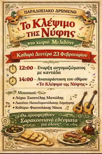 ΠΟΛΙΤΙΣΜΟΣ 20.02.2026 19:30Αναβιώνει την Καθαρά Δευτέρα το έθιμο του κλεψίματος της νύφης στο Μελιδόνι Μυλοποτάμου Ρέθεμνος Newsroom Facebook Twitter Copy link 0 Το παραδοσιακό έθιμο του κλεψίματος της νύφης θα αναβιώσει την Καθαρά Δευτέρα στο Μελιδόνι Μυλοποτάμου.Την εκδήλωση οργανώνει ο Πολιτιστικός Σύλλογος του χωριού στην κεντρική πλατεία στις 12μ. όπου θα αναβιώσουν και άλλα παραδοσιακά έθιμα της ημέρας. 0 Facebook Twitter Copy link ΣΧΕΤΙΚΑ ΑΡΘΡΑ Πολιτισμός 20.02.2026 14:52«CHECK IN για 2» του Μάκη Τσούφη Πολιτισμός 19.02.2026 10:15Το Λύκειο Ελληνίδων Ρεθύμνης ανοίγει κύκλο διαλέξεων για την ελληνική γλώσσα Πολιτισμός 19.02.2026 10:1211ο Φεστιβάλ Αντίβαρο 2026 Πολιτισμός 18.02.2026 13:27Το The Garage Theatre παρουσιάζει το νέο θεατρικό έργο του Μάνου Λιουδάκη "Η Τελευταία Θάλασσα"