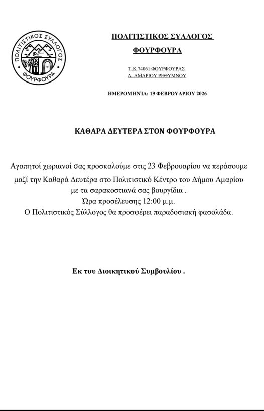 Ο Πολιτιστικός Σύλλογος Αρμένων Ρεθύμνου διοργανώνει και φέτος την αναβίωση των παραδοσιακών αποκριάτικων εθίμων της Καθαράς Δευτέρας με έμφαση στα Μουτζουρώματα και καλεί τον κόσμο για άλλη μια χρονιά να «σπάσει τα κούλουμα» στους Αρμένους.
