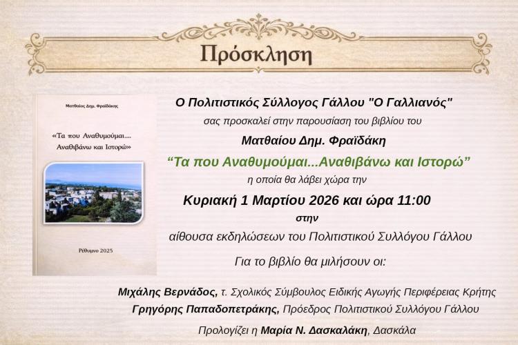Η παρουσίαση θα γίνει στις 11 το πρωί της Κυριακής στην αίθουσα του Πολιτιστικού Συλλόγου Γάλλου και θα μιλήσουν ο τ. Σχολικός Σύμβουλος Ειδικής Αγωγής της Περιφέρειας Κρήτης κ. Μιχάλης Βερνάρδος και ο Πρόεδρος του συλλόγου "Ο Γαλλιανός" κ. Γρηγόρης Παπαδοπετράκης. Προλογίζει η δασκάλα Μαρία Ν. Δασκαλάκη.