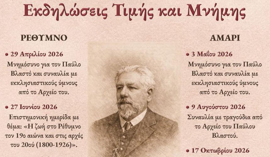 η Χορωδία και Ορχήστρα Παραδοσιακής Μουσικής «Παύλος Βλαστός» συν-διοργανώνει με την Ιερά Μητρόπολη Ρεθύμνης και Αυλοποτάμου, με την Περιφέρεια Κρήτης, τον Δήμο Ρεθύμνου και την Ιστορική Λαογραφική εταιρία Ρεθύμνου, επιστημονική ημερίδα στο Ρέθυμνο το Σάββατο 27 Ιουνίου 2026 στο κέντρο κοινωνικής και πολιτιστικής διακονίας « Θεομήτωρ»