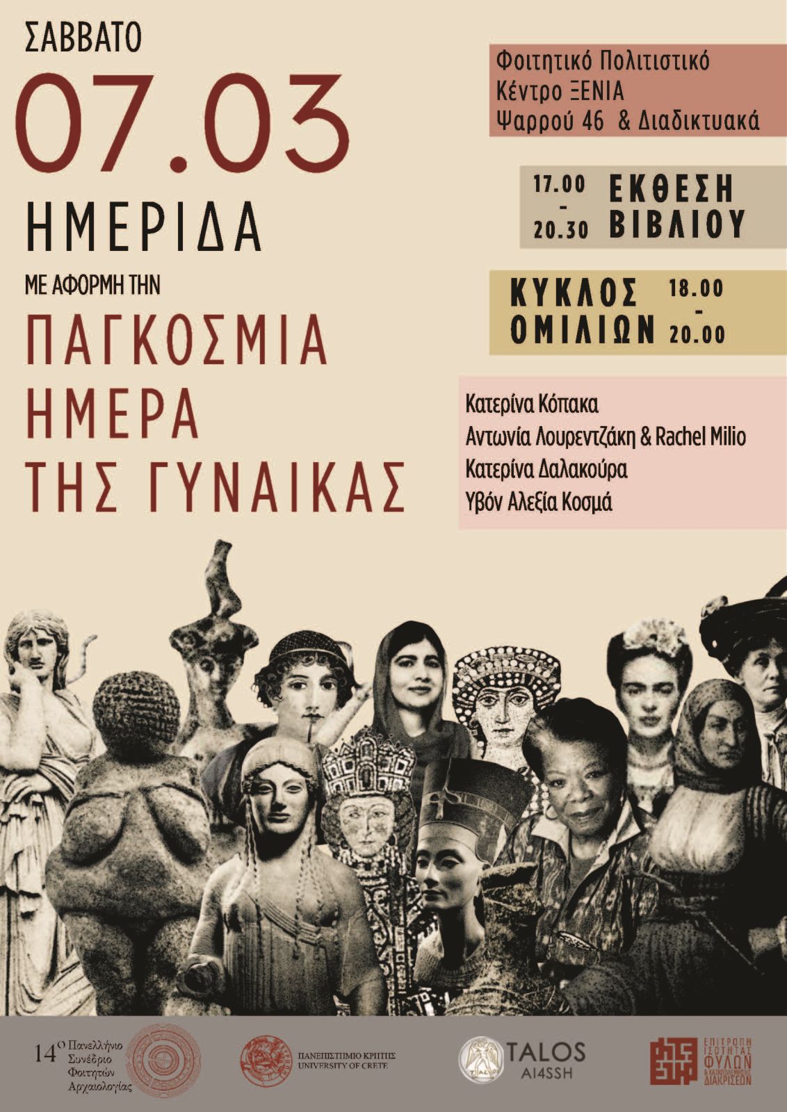 Με αφορμή την Παγκόσμια Ημέρα της Γυναίκας, το 14ο Πανελλήνιο Συνέδριο Φοιτητών Αρχαιολογίας διοργανώνει ανοιχτή ημερίδα το Σάββατο 7 Μαρτίου. Η εκδήλωση θα πραγματοποιηθεί στο Φοιτητικό Πολιτιστικό Κέντρο «ΞΕΝΙΑ» (Ψαρρού 46), ενώ θα υπάρχει και δυνατότητα διαδικτυακής παρακολούθησης μέσω της πλατφόρμας Microsoft Teams.