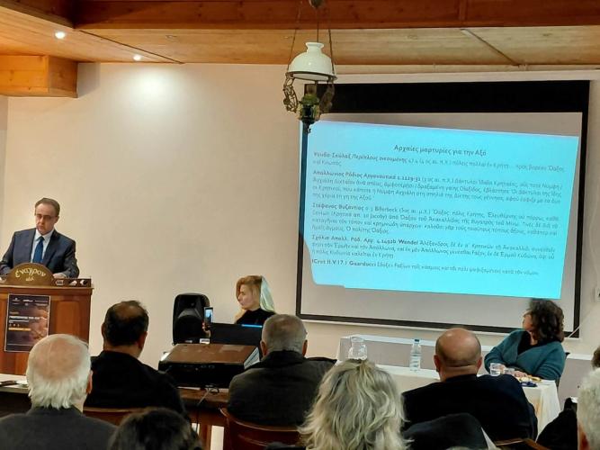 Στο επιστημονικό σκέλος της ημερίδας, η εισήγηση του αξιότιμου καθηγητή του Τμήματος Φιλολογίας του Πανεπιστημίου Κρήτης και πρώην Αντιπρύτανη κ. Κωνσταντίνου Σπανουδάκη διαμόρφωσε ένα συνεκτικό και τεκμηριωμένο συμπέρασμα για τη θέση της Αξού στον αρχαίο κόσμο, βασισμένο αποκλειστικά σε γραπτές πηγές και επιγραφικά δεδομένα.
