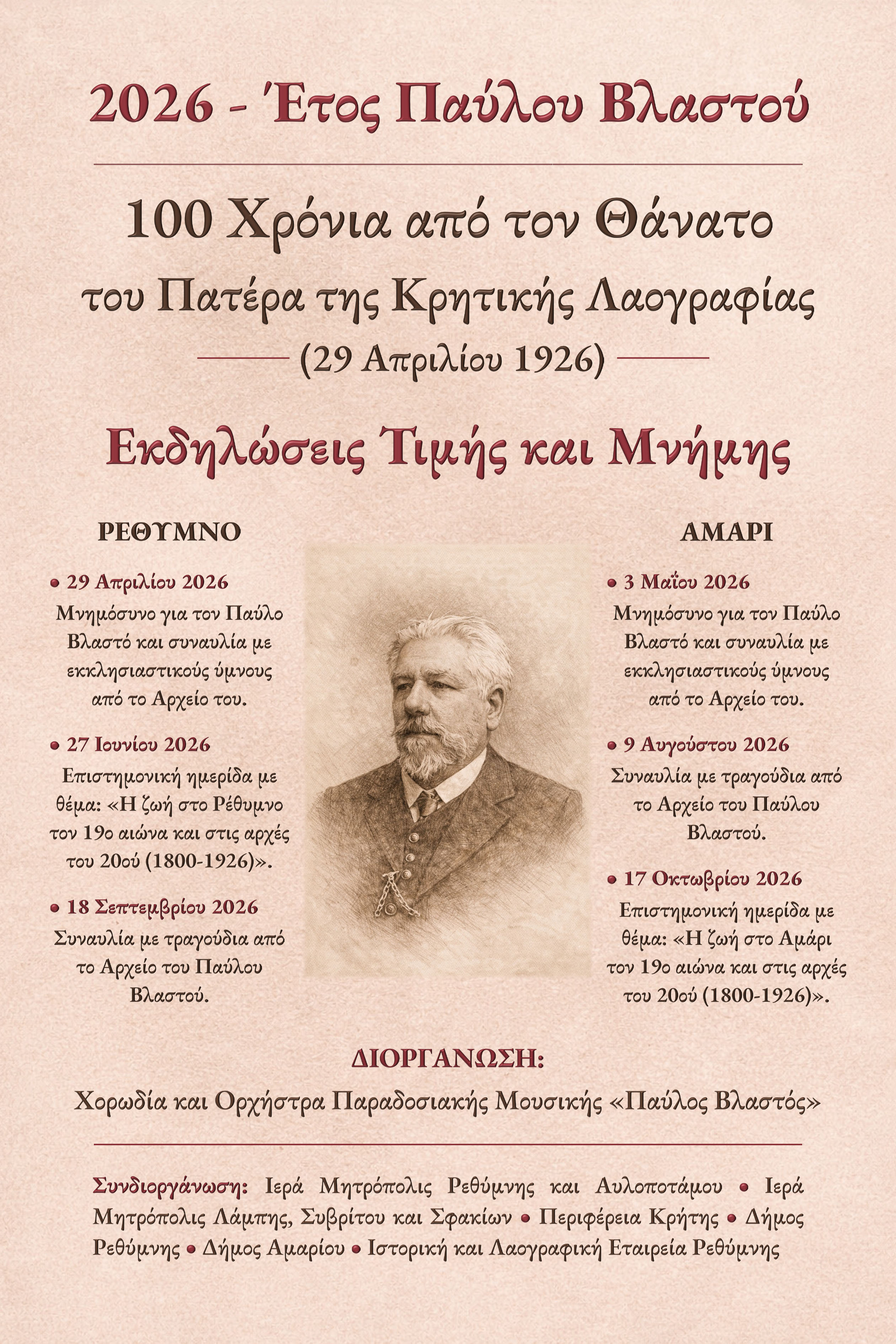 η Χορωδία και Ορχήστρα Παραδοσιακής Μουσικής «Παύλος Βλαστός» συν-διοργανώνει με την Ιερά Μητρόπολη Ρεθύμνης και Αυλοποτάμου, με την Περιφέρεια Κρήτης, τον Δήμο Ρεθύμνου και την Ιστορική Λαογραφική εταιρία Ρεθύμνου, επιστημονική ημερίδα στο Ρέθυμνο το Σάββατο 27 Ιουνίου 2026 στο κέντρο κοινωνικής και πολιτιστικής διακονίας « Θεομήτωρ»