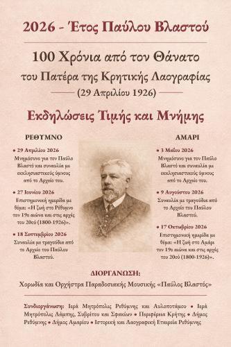 Με την ευκαιρία της συμπλήρωσης 100 χρόνων από τον θάνατο του Πατέρα της Κρητικής Λαογραφίας, Παύλου Βλαστού (1926–2026),
