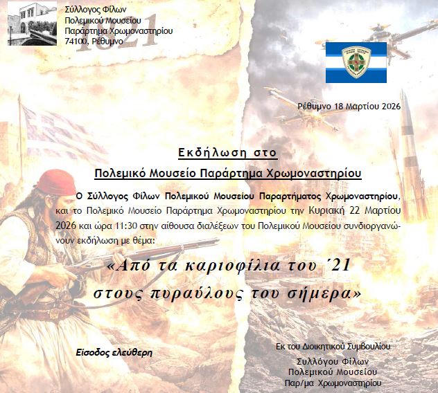 Ο Σύλλογος Φίλων Πολεμικού Μουσείου Παραρτήματος Χρωμοναστηρίου, και το Πολεμικό Μουσείο Παράρτημα Χρωμοναστηρίου την Κυριακή 22 Μαρτίου 2026 και ώρα 11:30 στην αίθουσα διαλέξεων του Πολεμικού Μουσείου συνδιοργανώνουν εκδήλωση με θέμα: